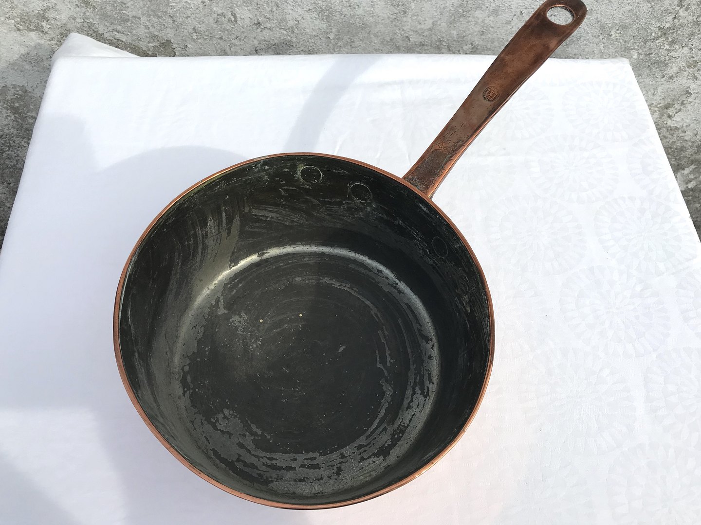 Copper saucepan, 24cm in diameter, 10.5cm high, Stamped NDB & 3 towers the year under the towers is indistinct. *Nice condition*