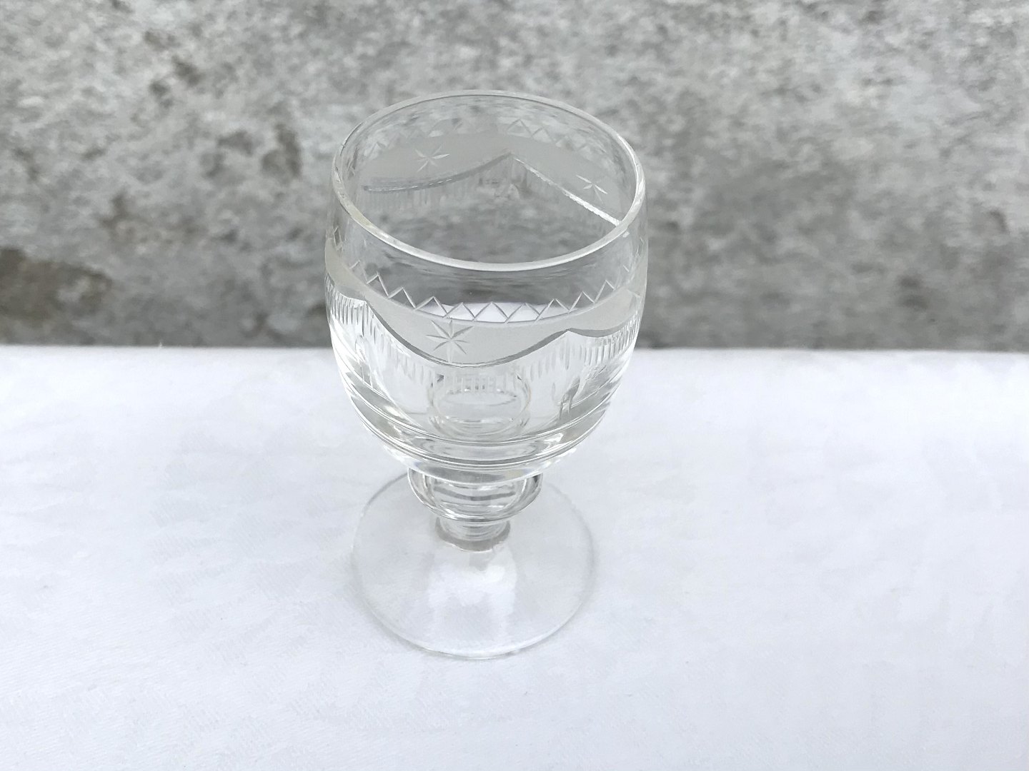 Glass with garland sandings from Lindahl Nielsen's glass grinder, Barrel-shaped glass, stem with button, Snaps, 7.3 cm high, 3.5 cm in diameter * Perfect condition *