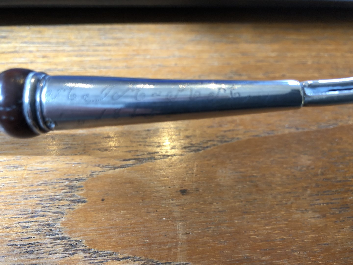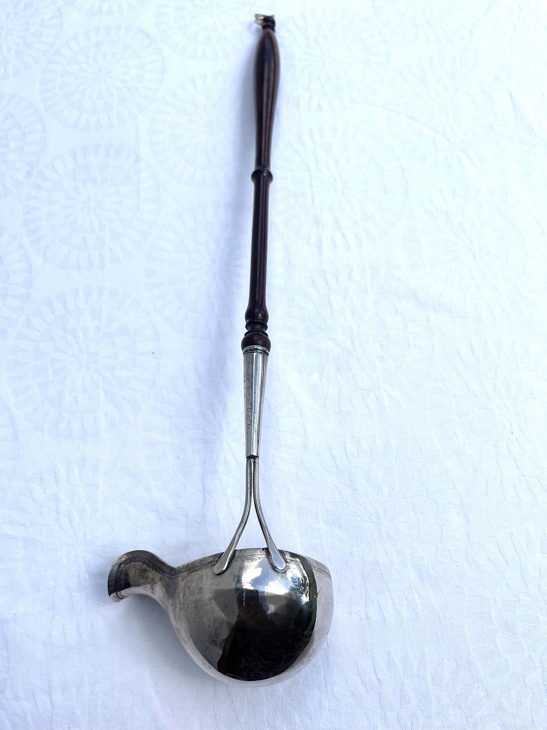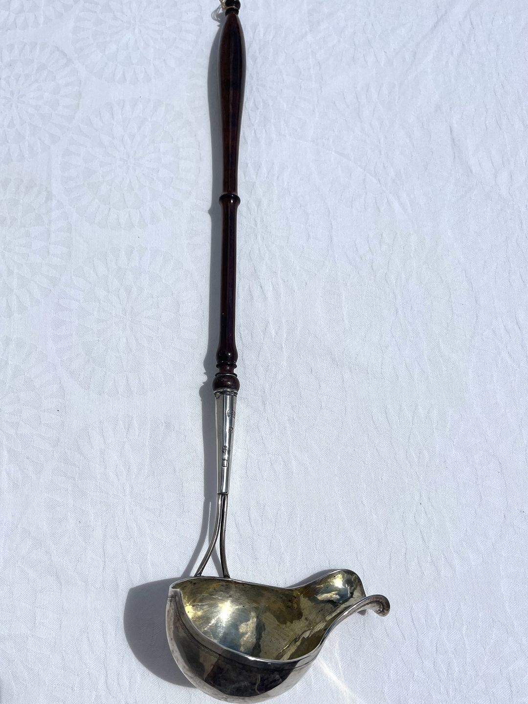 Silver punch spoon with wooden handle, Stamped RB for Rasmus Jørgensen Brock (Gets citizenship in Kbh. 1801 and dies in 1843) Stamped by Stadsguardein Frederik Fabritius (1787-1823), on the back engraved with the owner's initials and the year 1815. (see photo) 10cm wide, 40cm long *Nice condition*