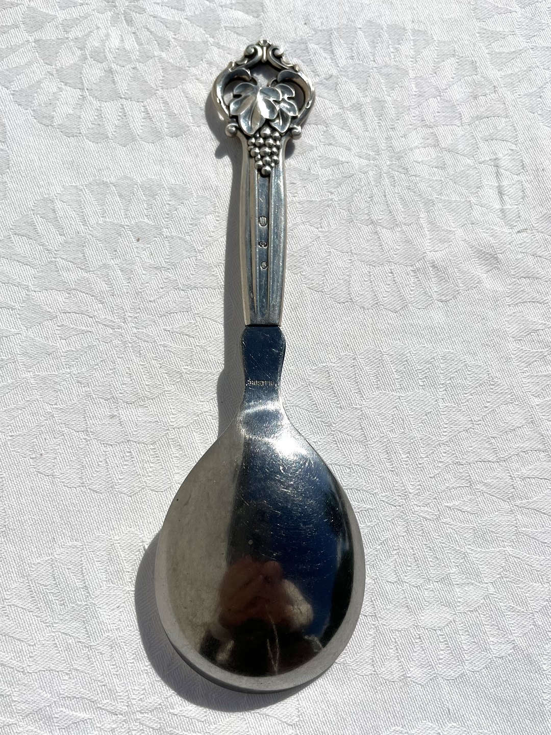 Grape clusters serving spoon in three-towered silver (830S) from Cohr silver goods factory. Produced in 1947. 18.5 cm long. Nice condition.