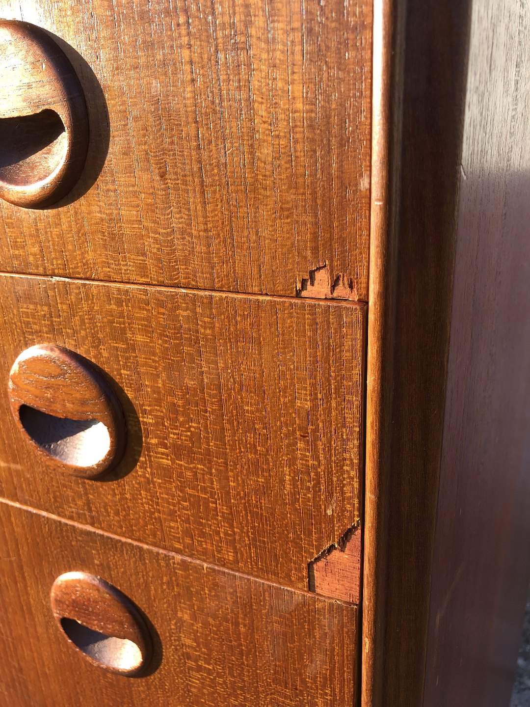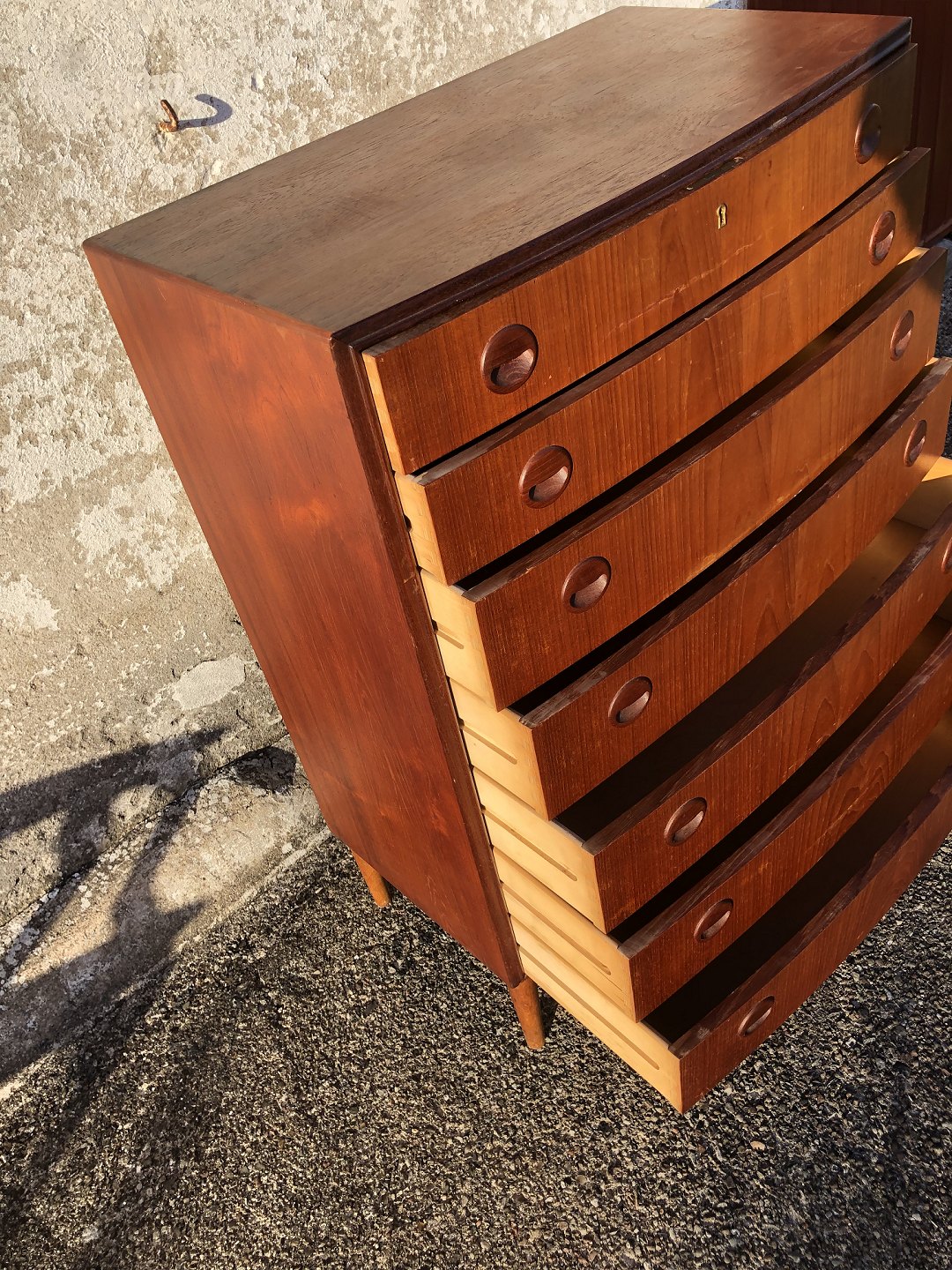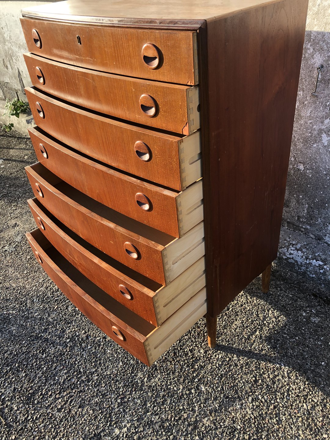 Chest of drawers in teak veneer from the 1960s with curved front. Appears to have fine handles but with some veneer chips / scratches. (see photo) Danish modern. 113x80x44 cm