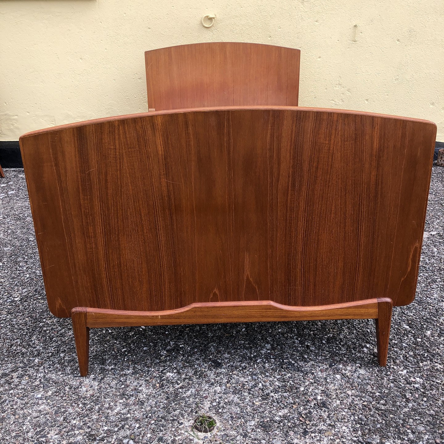 Two beds in teak veneer, with slatted base. Danish modern from the 1960s. Please note that the headboard against the wall is not veneered (see last photo) and the beds are sold without mattresses. Appears in good condition.