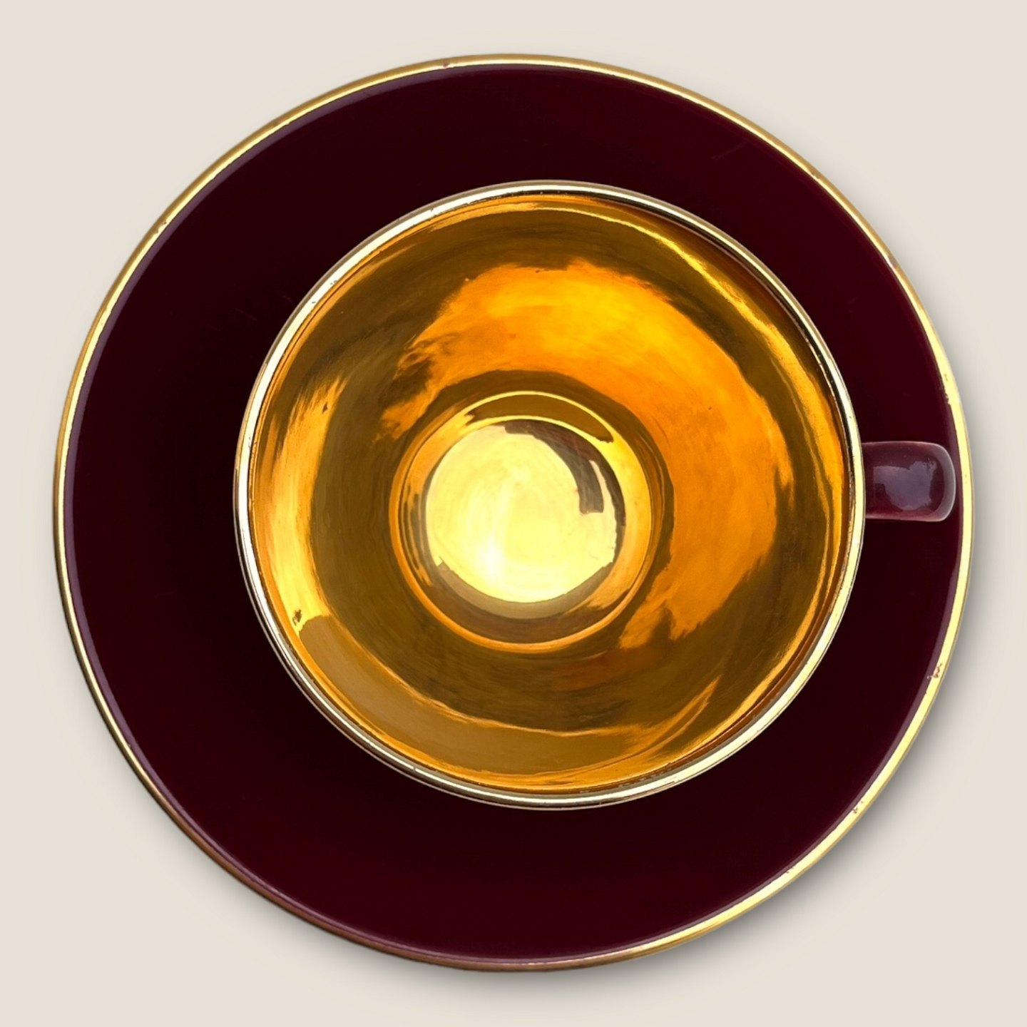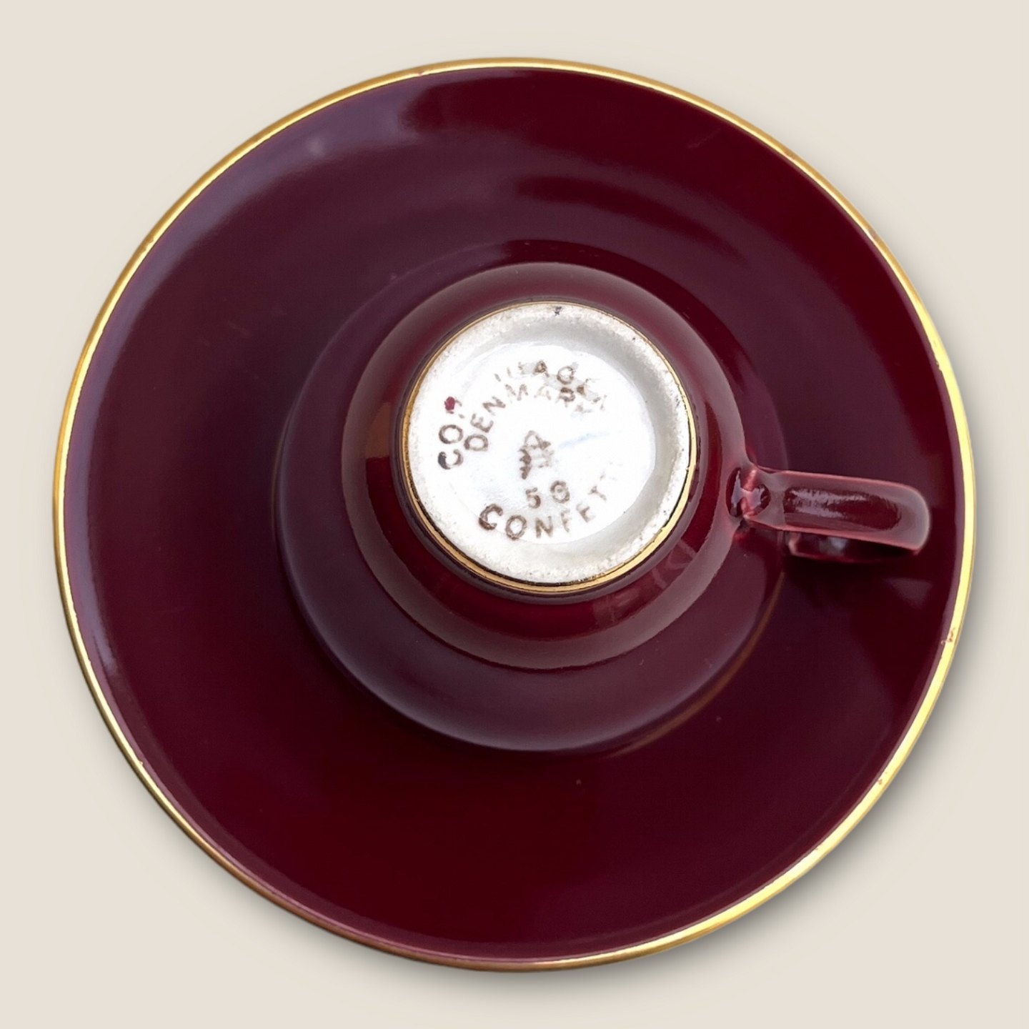 Royal Copenhagen, Aluminia, Mocca cup, Bordeaux Red, 7 cm in diameter, 5.5 cm high, Saucer with gold rim *Nice condition*