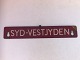 Train sign: NORDJYDEN / SYD-VESTJYDEN, Mål. 39 x 6.4cm.