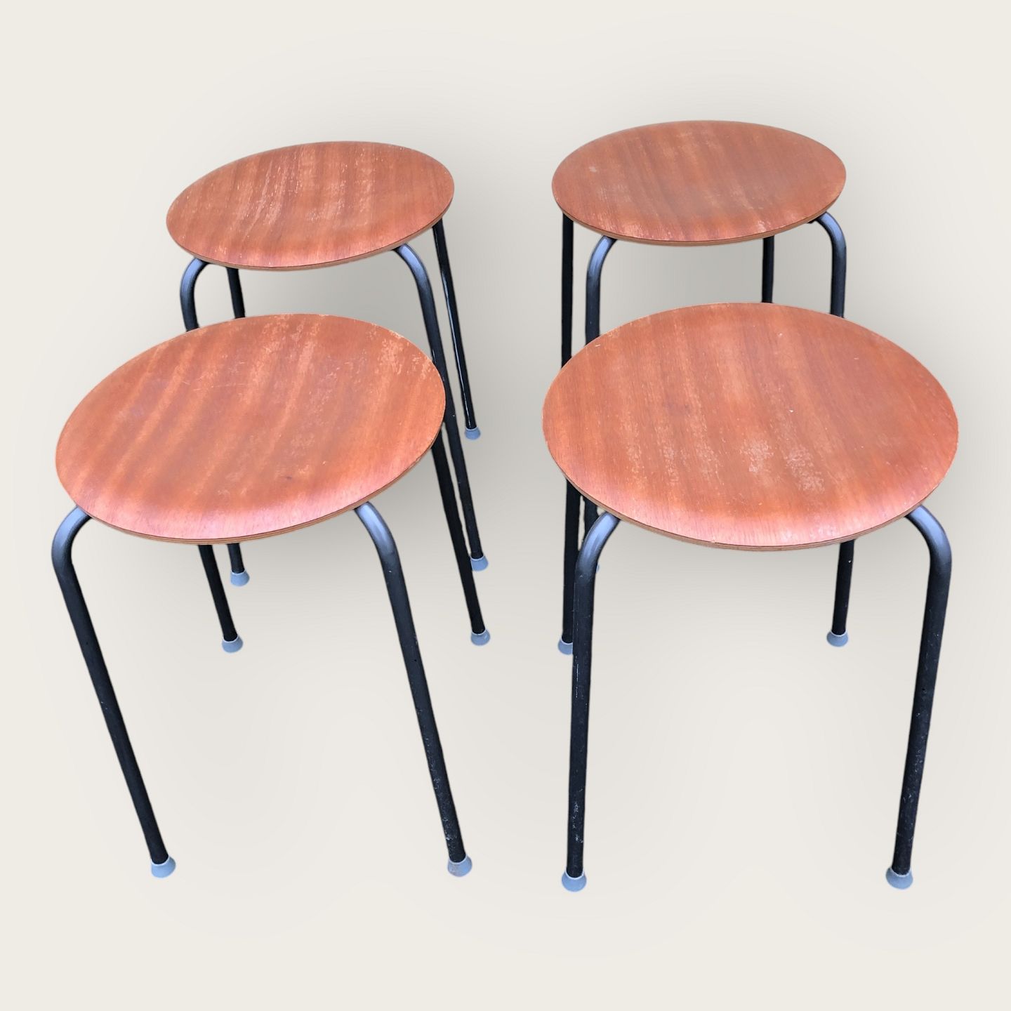 Stool / Stool with teak veneer seat and 4 steel legs, Brand: Made in Denmark, Danish modern from the 1960s, Height 45cm, diameter 32.5 cm, appears in good condition with few signs of wear.