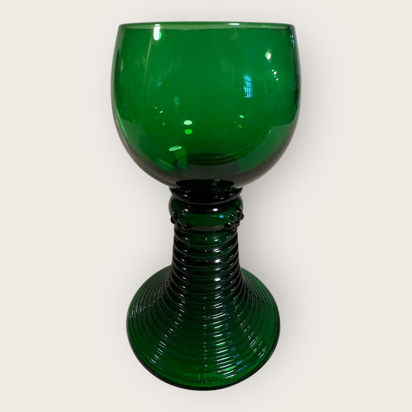 Green rhomar glass from Holmegaard with rosettes, Height 12.7cm, diameter rim 5.4cm, base 7.5cm