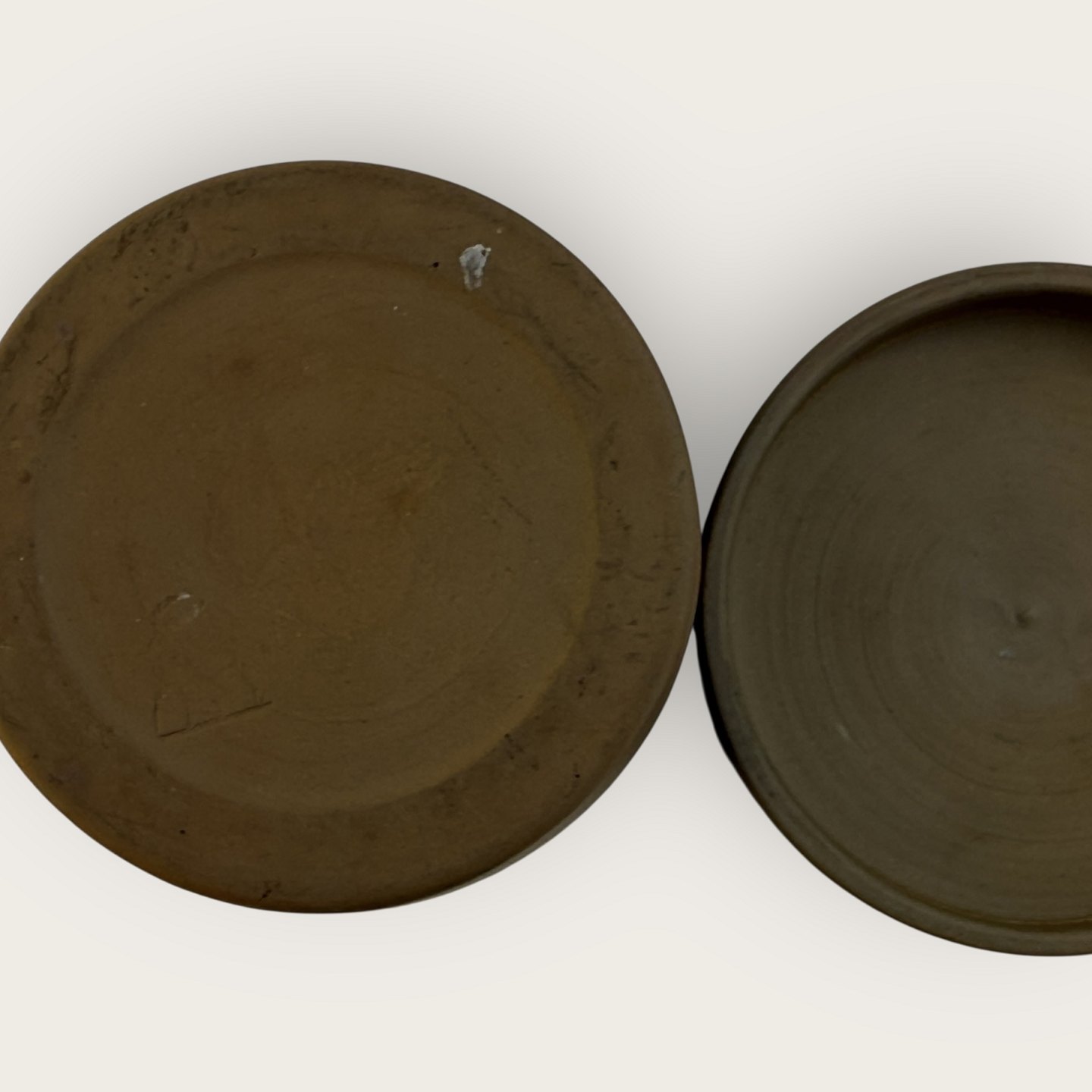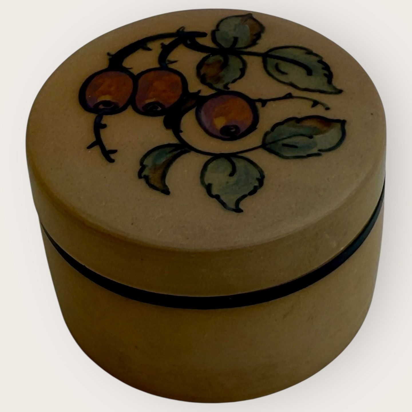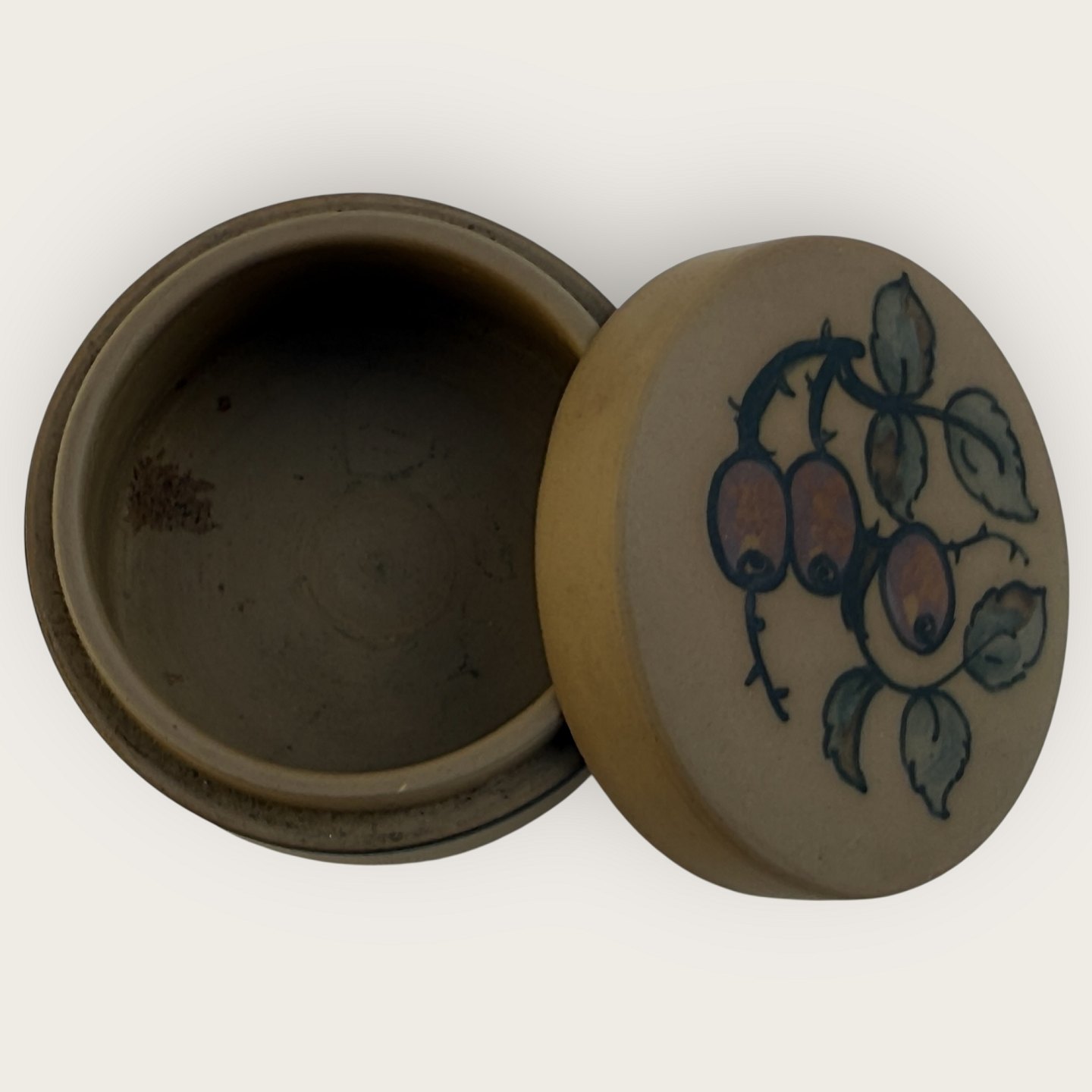 Bornholm ceramics, Hjorth, Brown stoneware, Bonbonniere / Small round box with berry decoration, Height 3.5cm, diameter 5.5cm *Good condition*