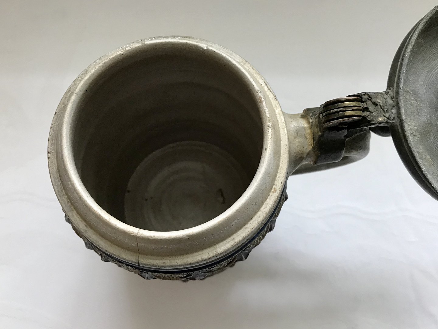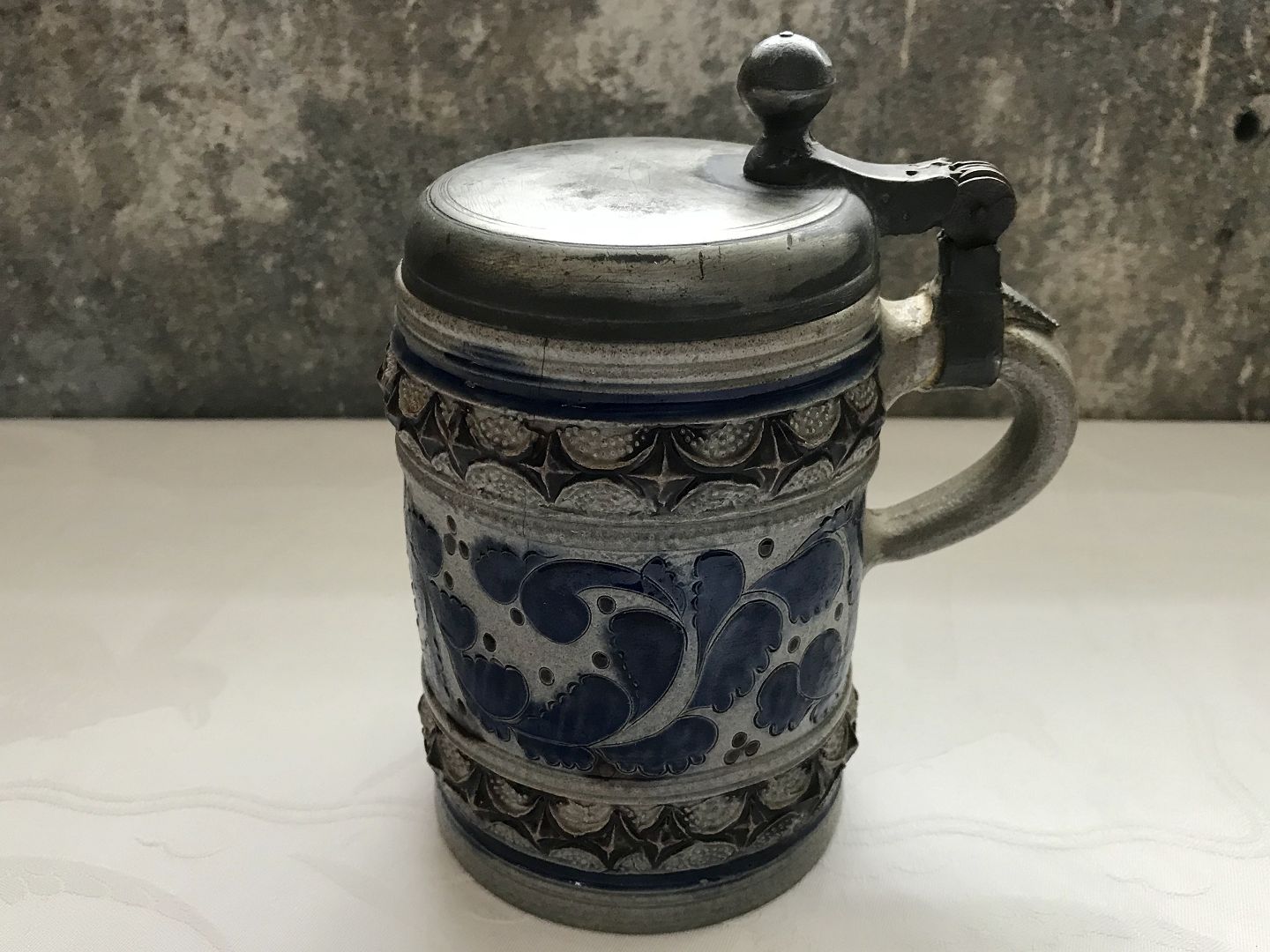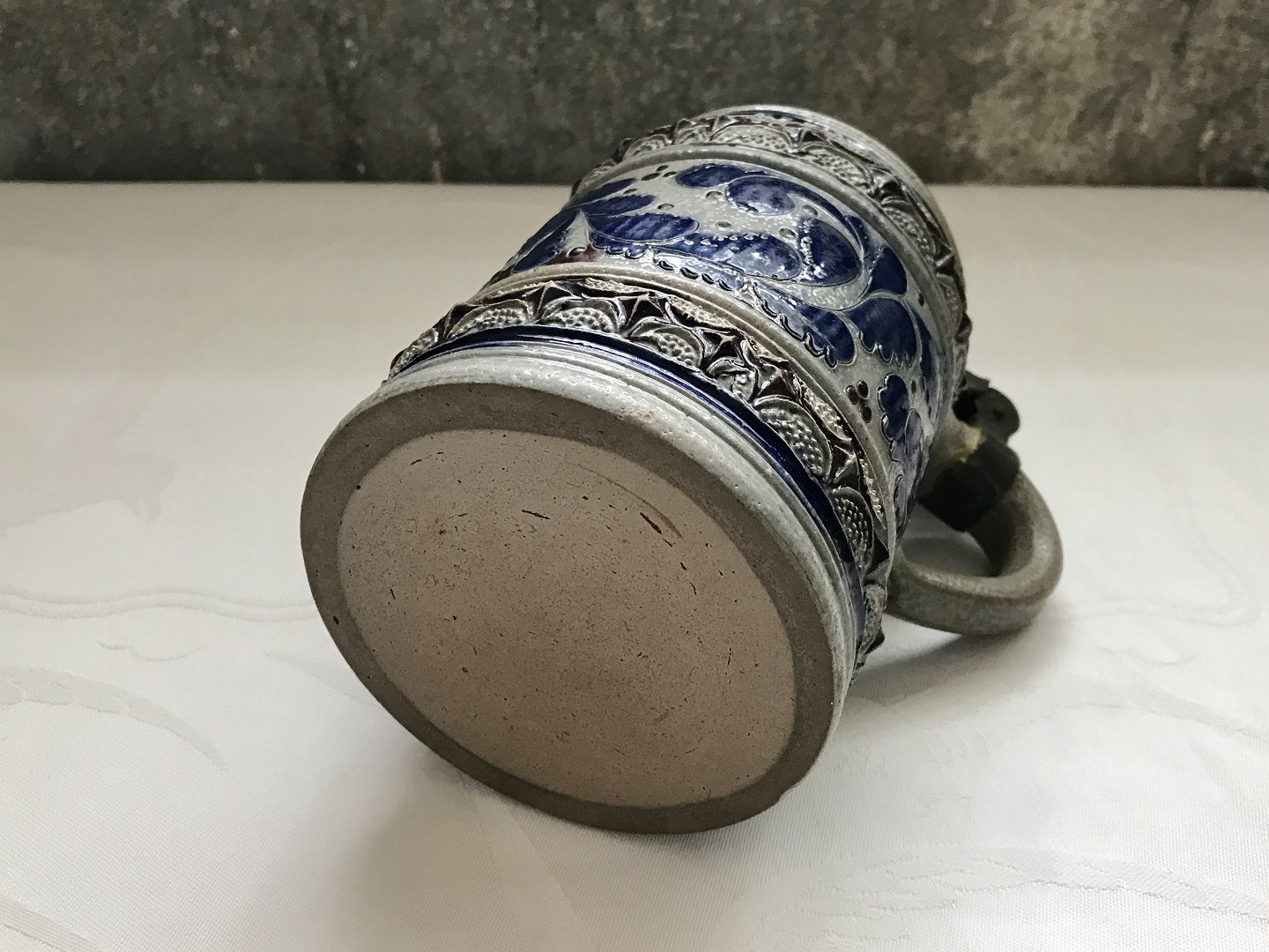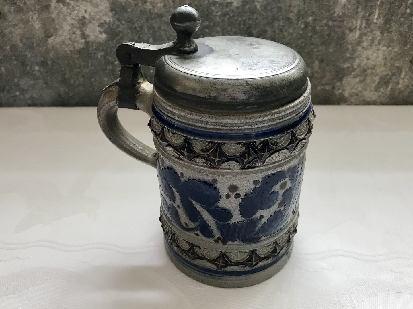 Deutscher Bierkrug aus salzglasiertem Steinzeug, 18 cm hoch, 8 cm Durchmesser, * mit Riss *