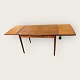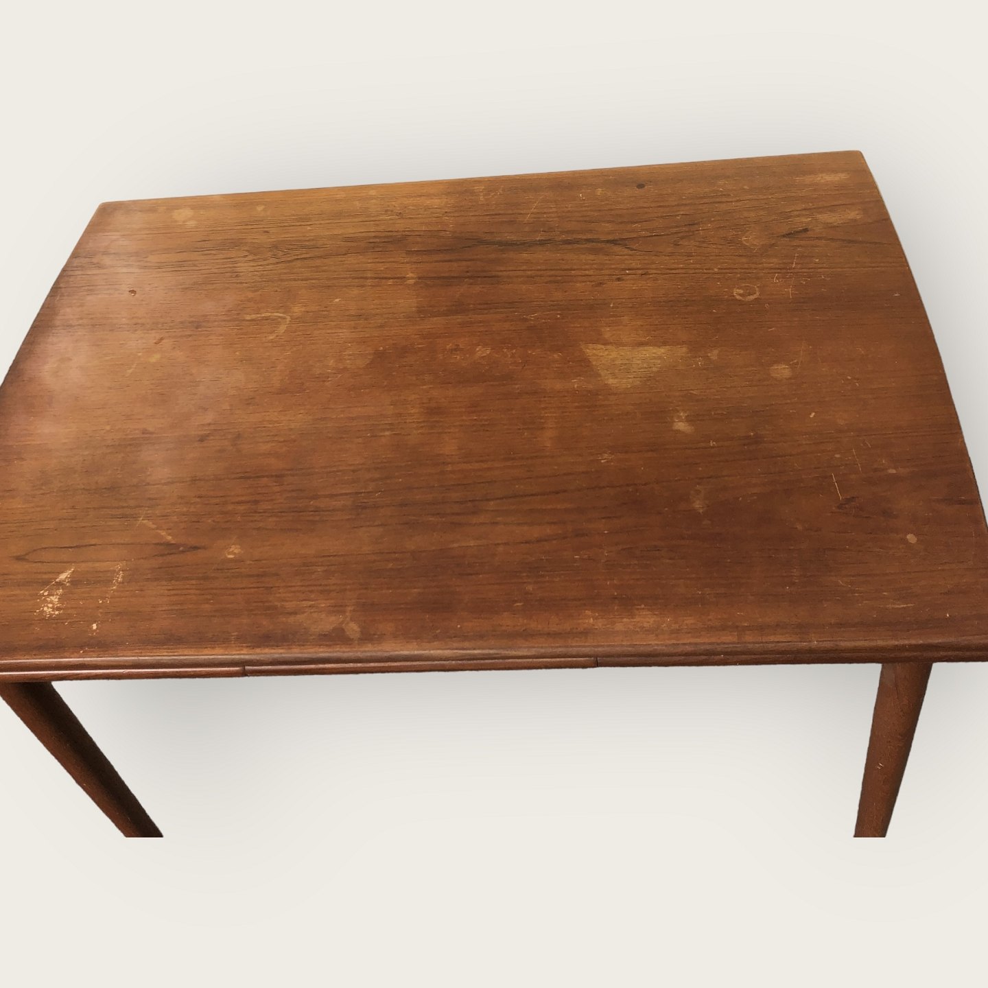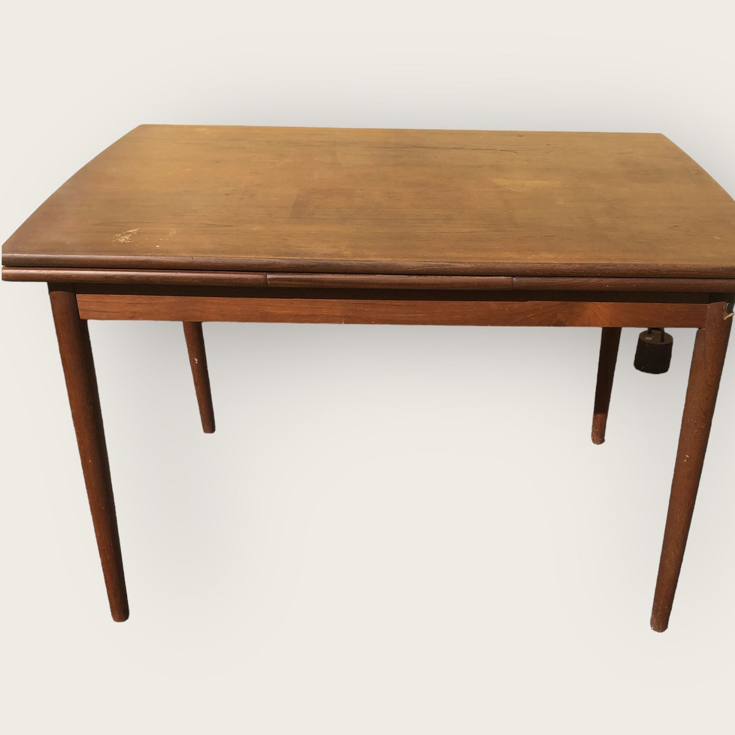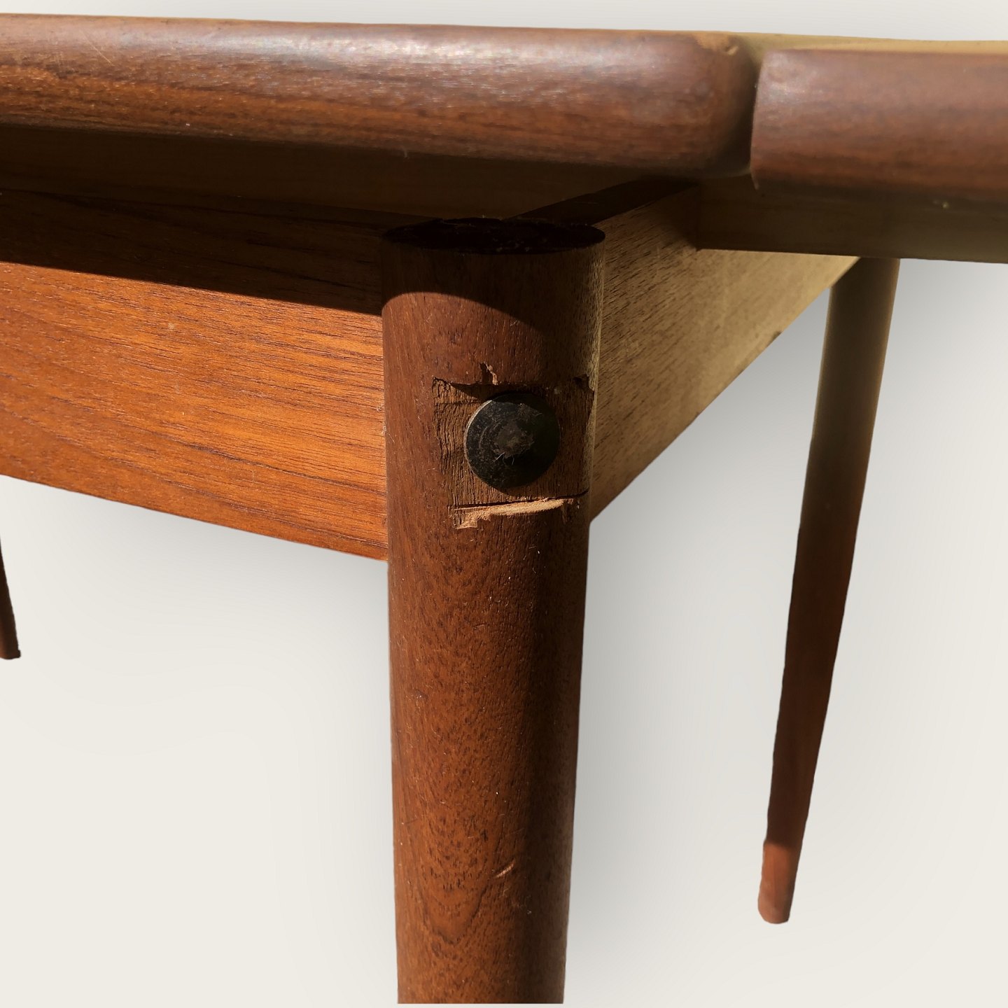 Esstisch aus Teakfurnier. Dänische Moderne aus den 1960er Jahren. Hat Gebrauchsspuren und ein Bein, das mit einer Durchgangsschraube repariert wurde (siehe Foto). Abmessungen: HxBxB 75x116(192)x76 cm
