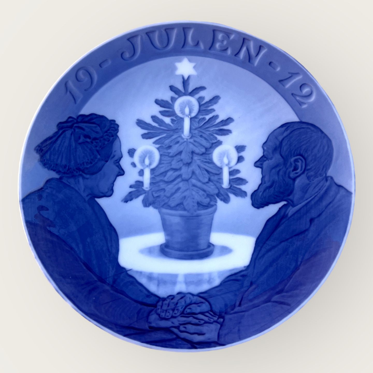 Royal Copenhagen, Juleplatte, 1912, Zwei ältere Menschen an einem Tisch mit einem Weihnachtsbaum, 18 cm Durchmesser, Design Christian Thomsen *Perfekter Zustand*