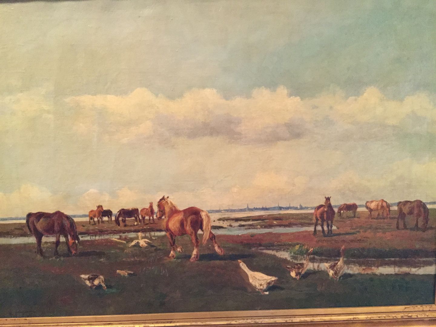 Niels Christiansen, Heste og gæs på Saltholm med antydning af København i baggrunden, 95/66cm uden ramme, 114/85cm med ramme, Signeret: N. Chr. *Rammen med farveforskel ellers pæn stand*