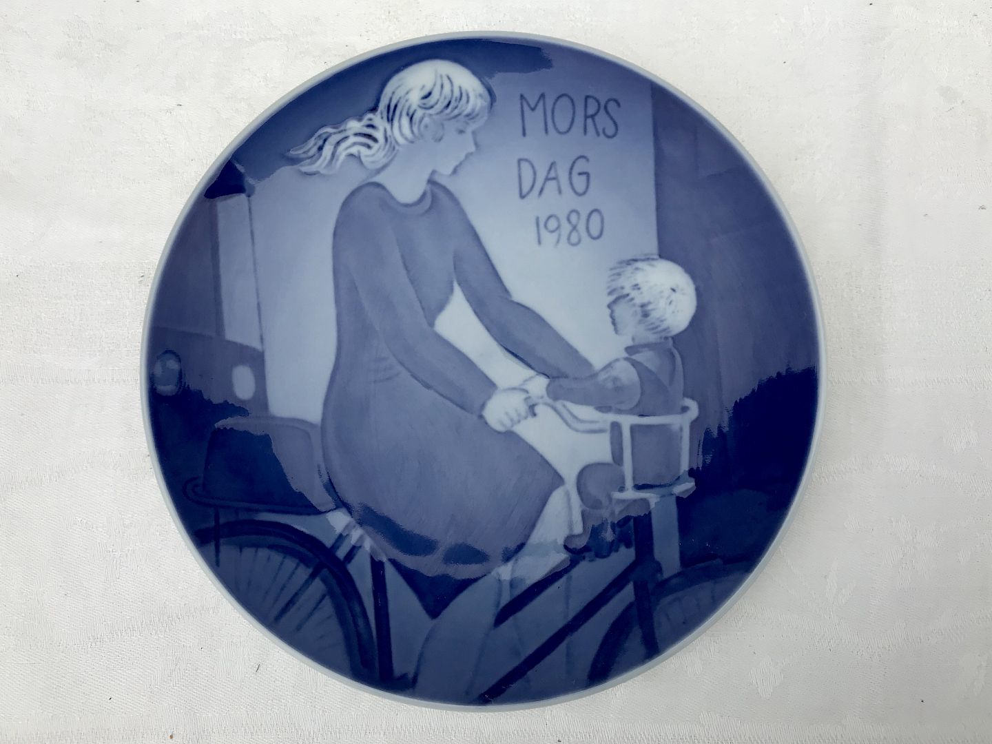 Royal Copenhagen, Mors dag platte, 1980, Mor på cykel med barn, 18cm i diameter, Design Ib Spang Olsen *Perfekt stand*