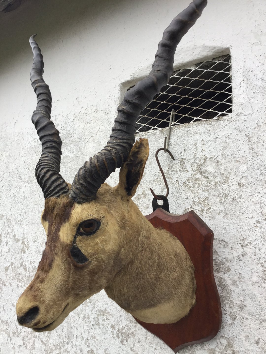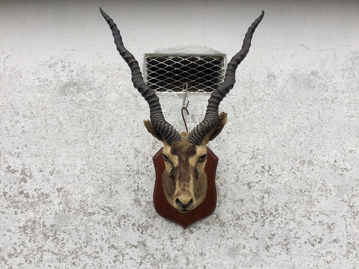 Hunting trophy. Antelope with twisted horns. Height from the bottom of the plate to the tip of the horn: 78 cm. The snout is 37 cm from the wall.