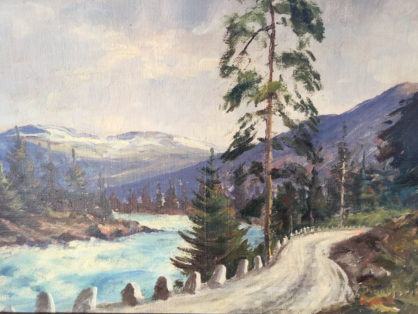 Signed "E. Thorbjørn" for Evelyn Bøge Thorbjørn Andersen (1911-1990). Motif with River, road and mountains probably from Norway.