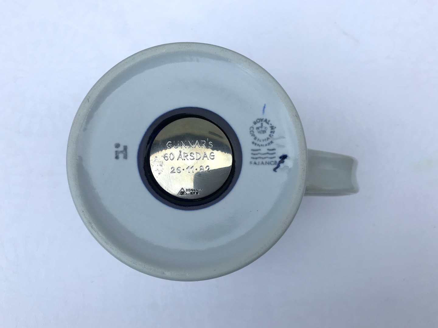 Royal Copenhagen, Aluminia, Stort årskrus, 1982, 12cm høj, Design Inge Lise Kofoed, Med sølvmontering *Perfekt stand*