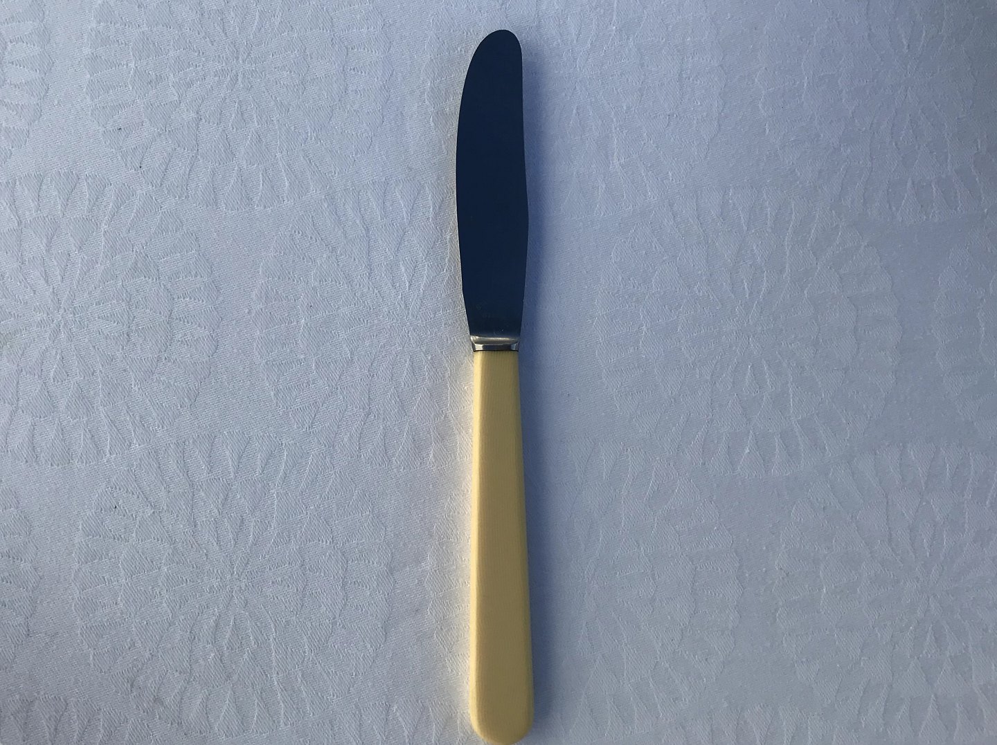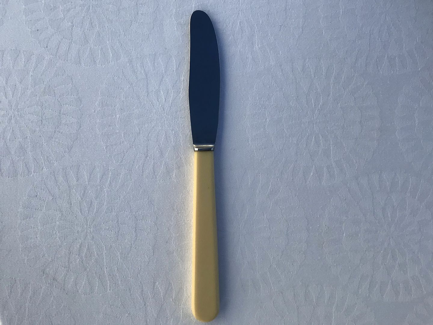 Middagskniv, Raadvad, Med hvidt Kunststofskaft, 20,8cm lang *Pæn stand*