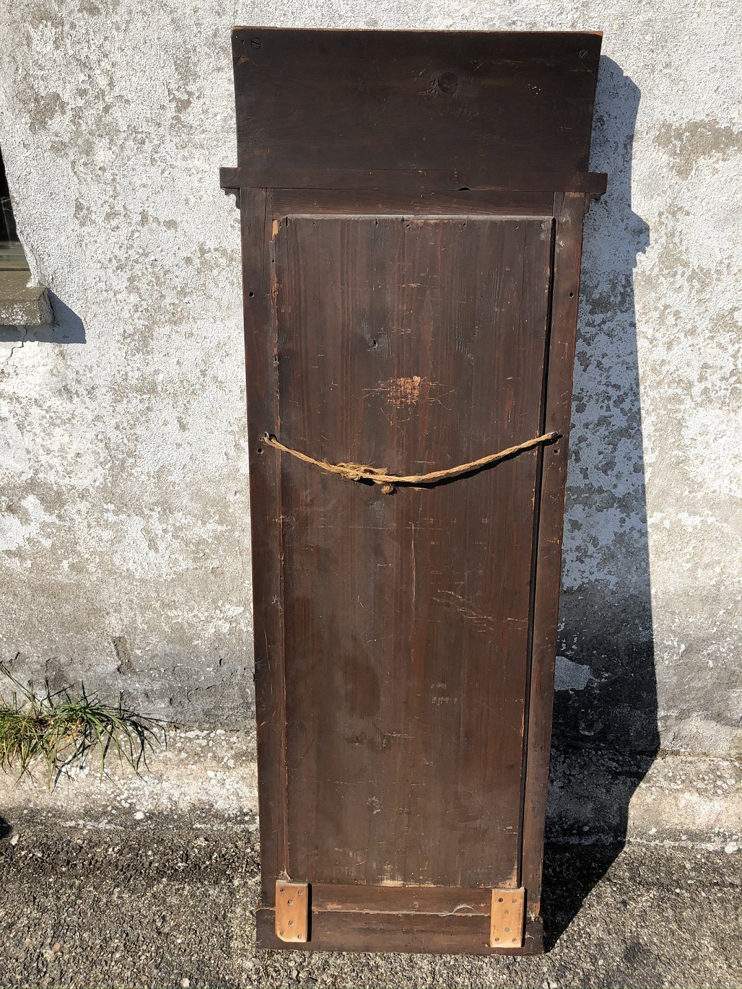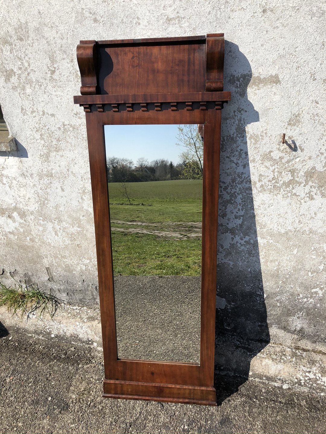 Spejl i ramme af mahognifiner fra ca. 1880. Enkelte sprækker, skævhed, afslag øverst (se foto) - ellers pæn brugt stand.
