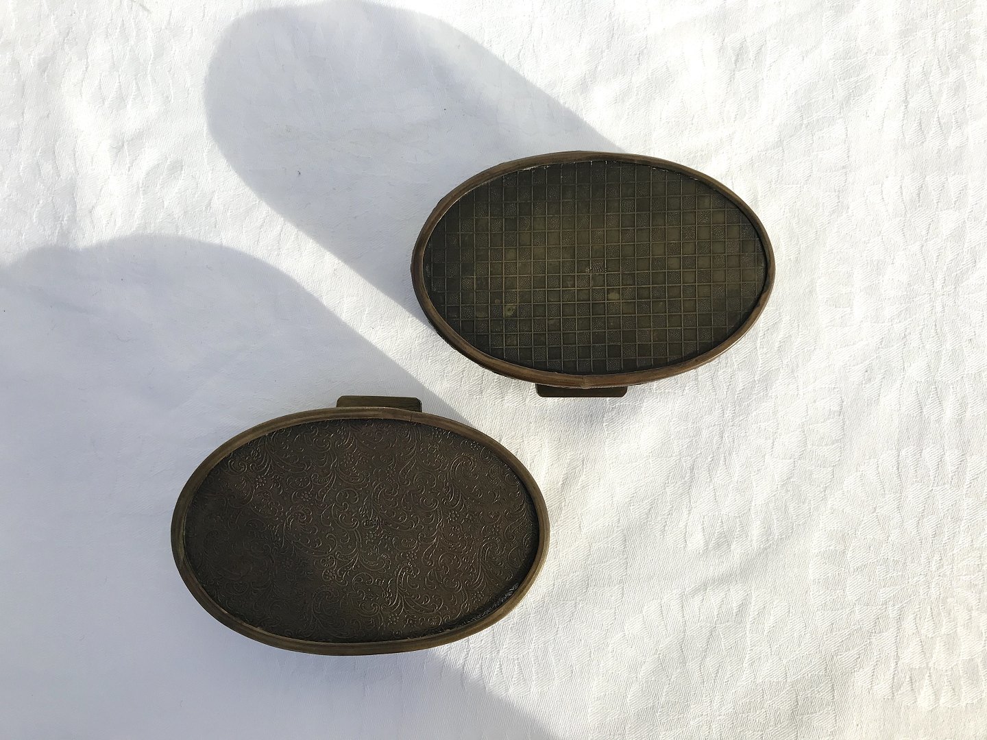 2 almost identical bronze chests / boxes with rose motifs, stamped at the bottom: Bronze. 12cm long, 8cm wide, 3cm high, * Nice patinated condition *