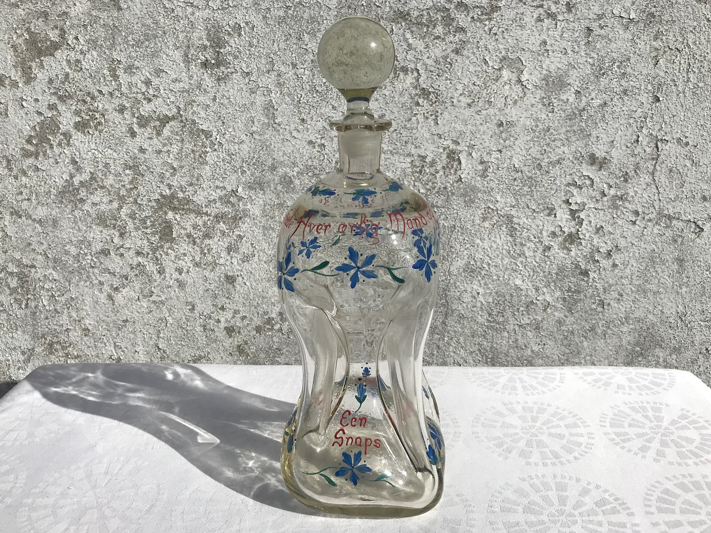 Holmegaard, Med emaljedekoration fra Malerstuen i Nyhavn, Hver ærlig mand og kvinde, Huset gæstfrit finde, En snaps er go bedre er to, 30cm høj, 10cm bred, Design Jacob E. Bang *Pæn stand*