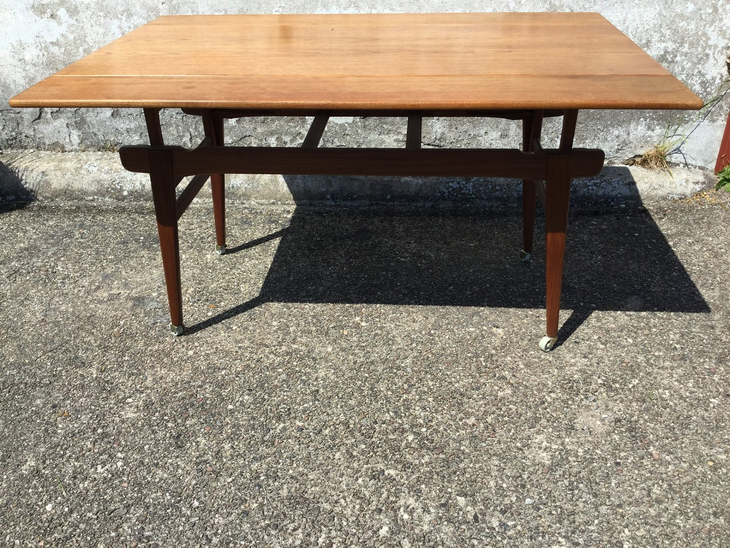 Sofabord / Spisebord med hæve/sænke funktion og udtræk i siderne. Teakfiner, Danish modern fra 1960'erne. Højde spisebord 75 cm, højde sofabord 60 cm. Længde 135 cm, Bredde 55 cm (udslået 91cm). Pæn brugt stand.