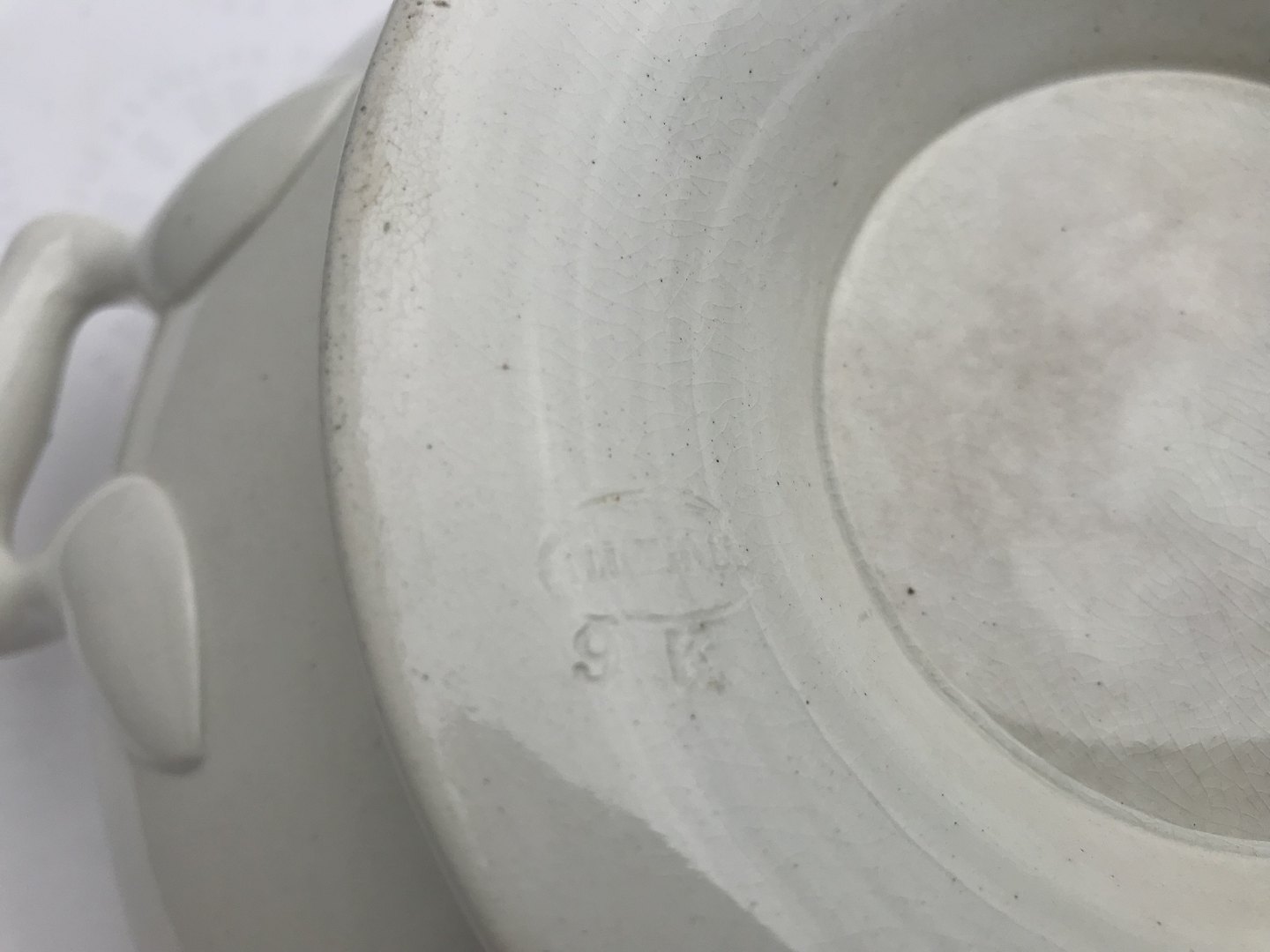 Stor fajance suppeterrin glat form med blå bånd, 23cm høj, 35cm i diameter *Pæn stand med aldersrelateret brugsspor*