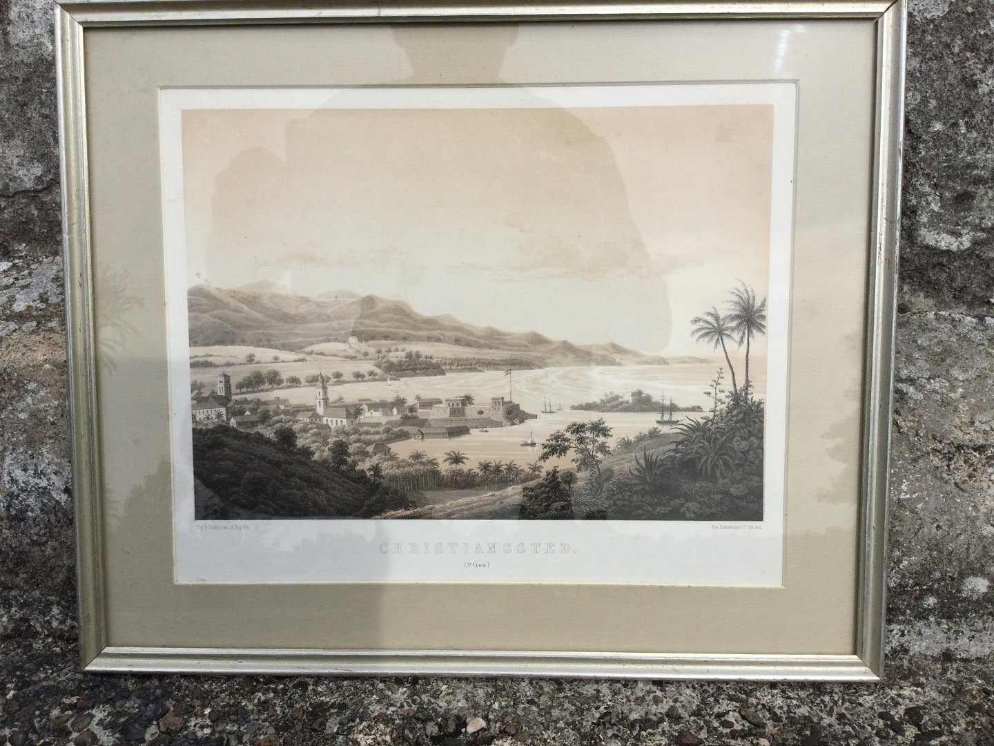 Indrammet litografi fra ca. 1840. Udsigt over Christiansted, St Croix. Af A. Nay efter tegning af Capt. P. Seidelin. Trykt hos Em. Bærentzen & Co. Fremstår med en smule fnuller under glasset ellers fin stand. Mål: 20x28 cm, med ramme 32x40cm