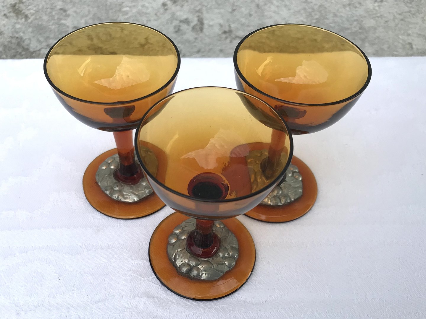 Likørskål, Ravfarvet, Med tin montering, 9cm i diameter, 8cm høj *Pæn stand*