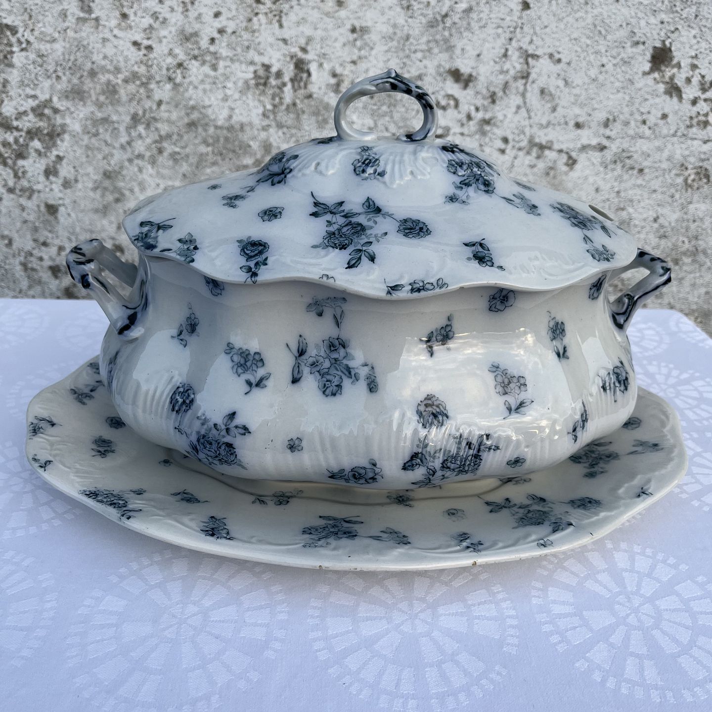 Engelsk fajance, Furnivals Limited, Stor terrin med underfad, 35cm bred, 20,5cm høj *Med enkelte små glasurpletter*