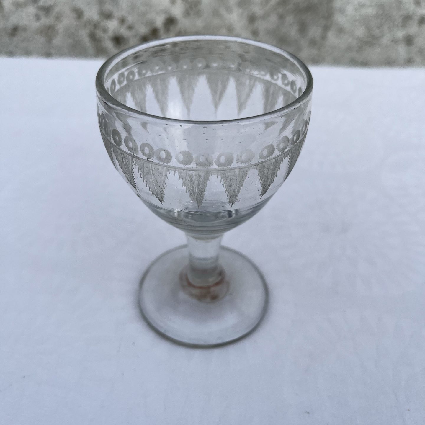 Older wine glasses with a matt sanding many ceiling bubbles / irregularities in the glass mass, 10.5 cm high, 7 cm in diameter, Presumably Swedish or Norwegian * Nice condition *