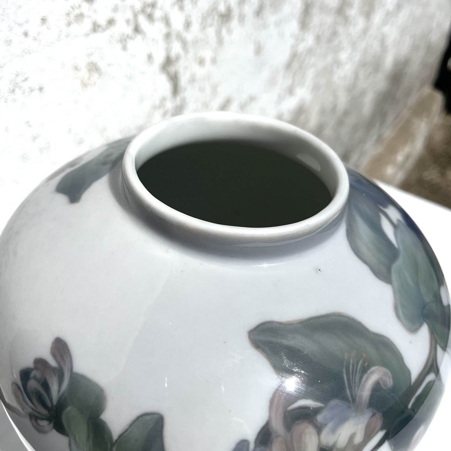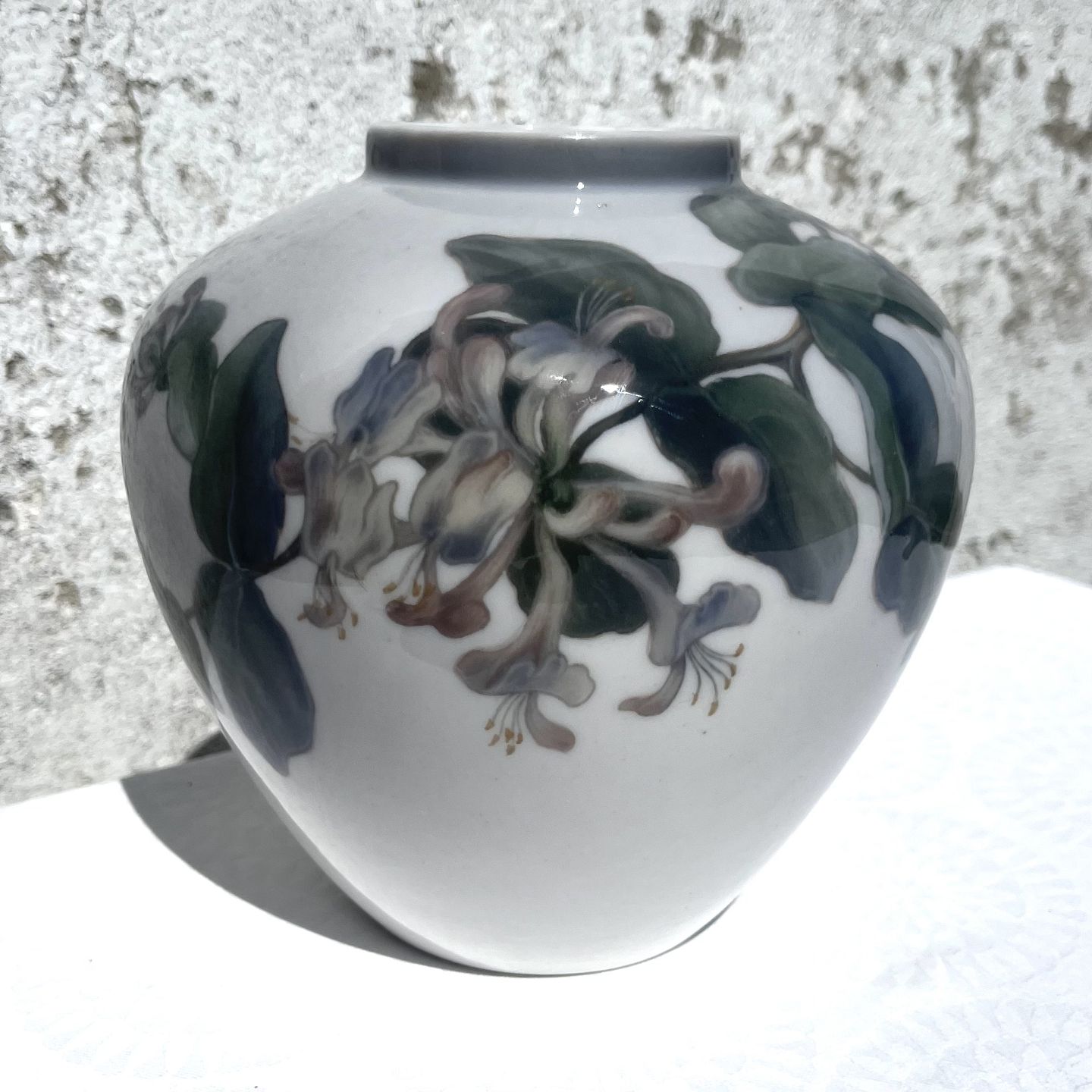 Royal Copenhagen, Art nouveau vase with honeysuckle flower, 19.5 cm high, 21 cm in diameter, 1st grade * Nice condition but with small glaze defect *