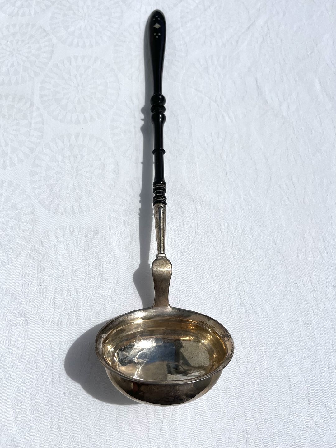 Punchske / Potageske med træskaft med perlemorsindlægninger, Stemplet lidt utydeligt se sidste foto. 10cm bred, 41cm lang * Enkelte småbuler i bunden af skeen