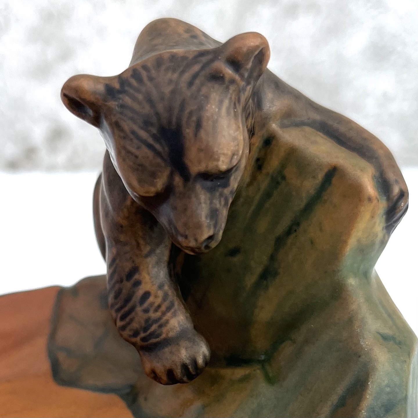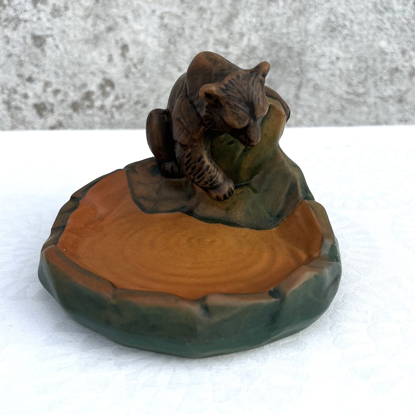 P. Ipsens enke, Bjørneunge på kanten af skål, 8,5cm høj, 12cm bred, Nr. 222 *Pæn stand*