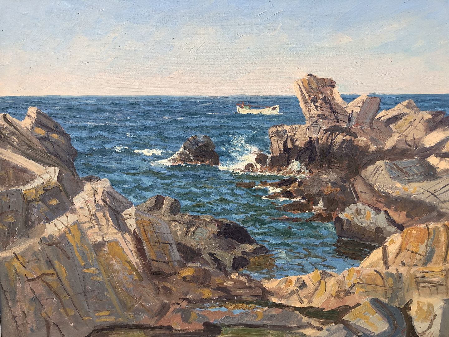 C. Corell, Kystlandskab Bornholm, Oliemaleri på lærred. Mål med ramme 91,5 x 83 cm. Enkelte brugsspor på rammen ellers pæn stand.
