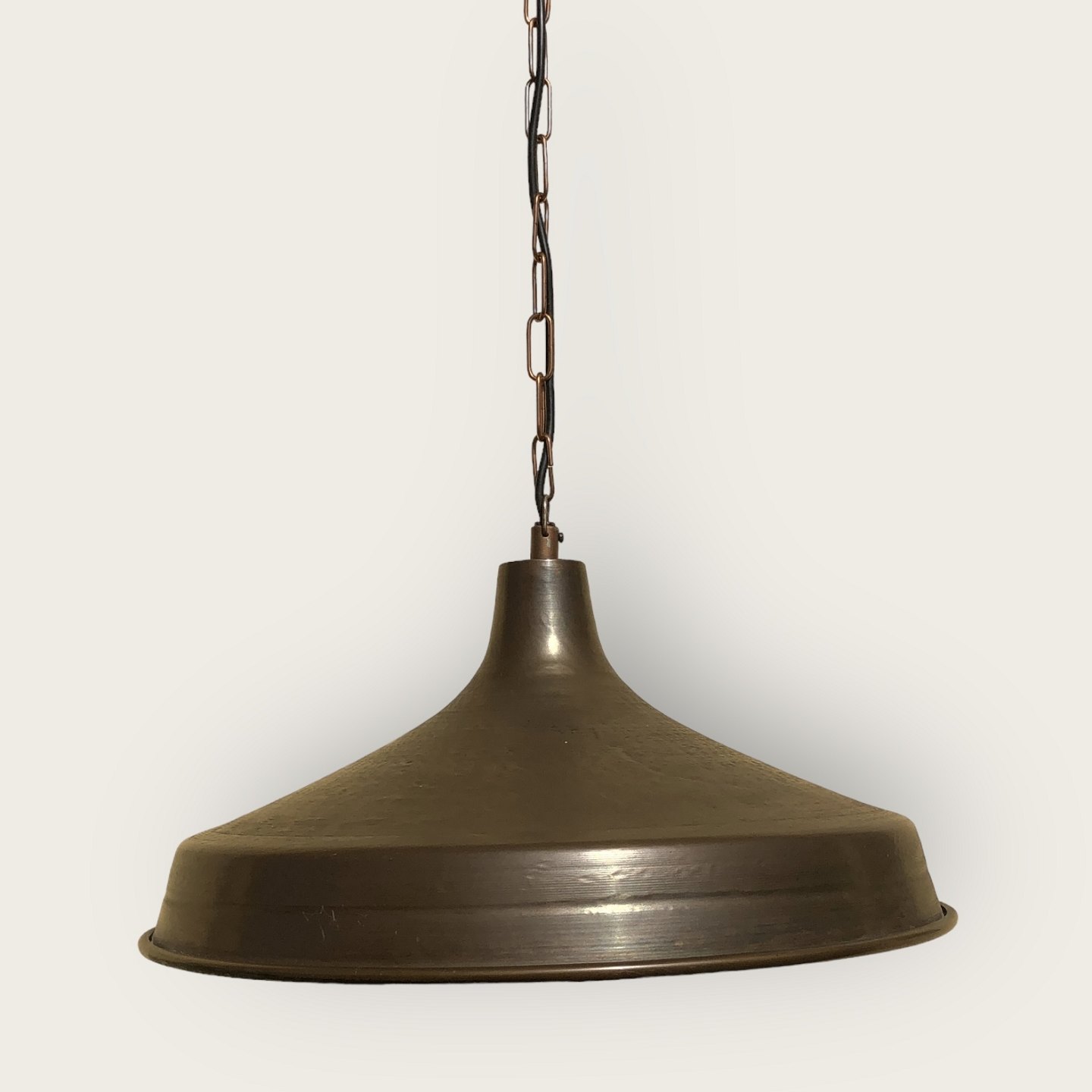 Kobberlampe med kædeophæng. Diameter 43 cm. Pæn brugt stand.