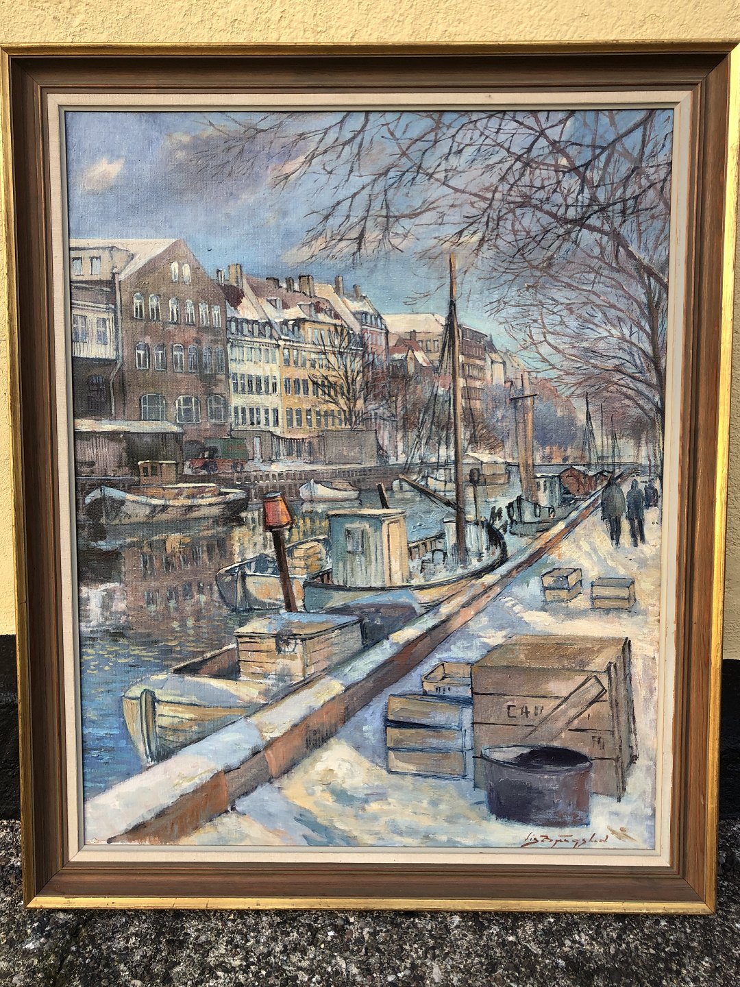 Lis Bjergsted (1922-1971), Oliemaleri på lærred, Christianshavns kanal, Mål med ramme: 84x69 cm