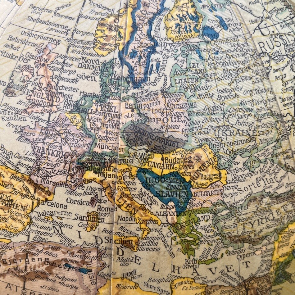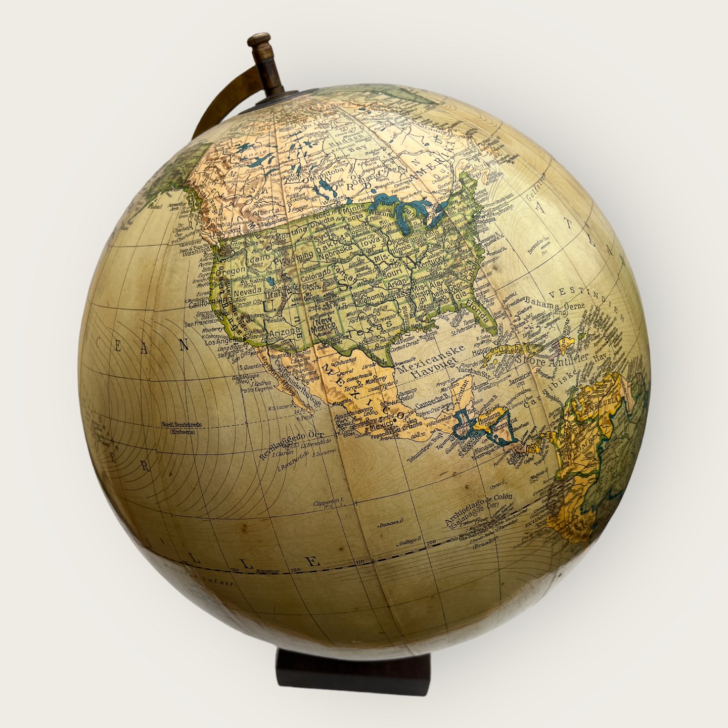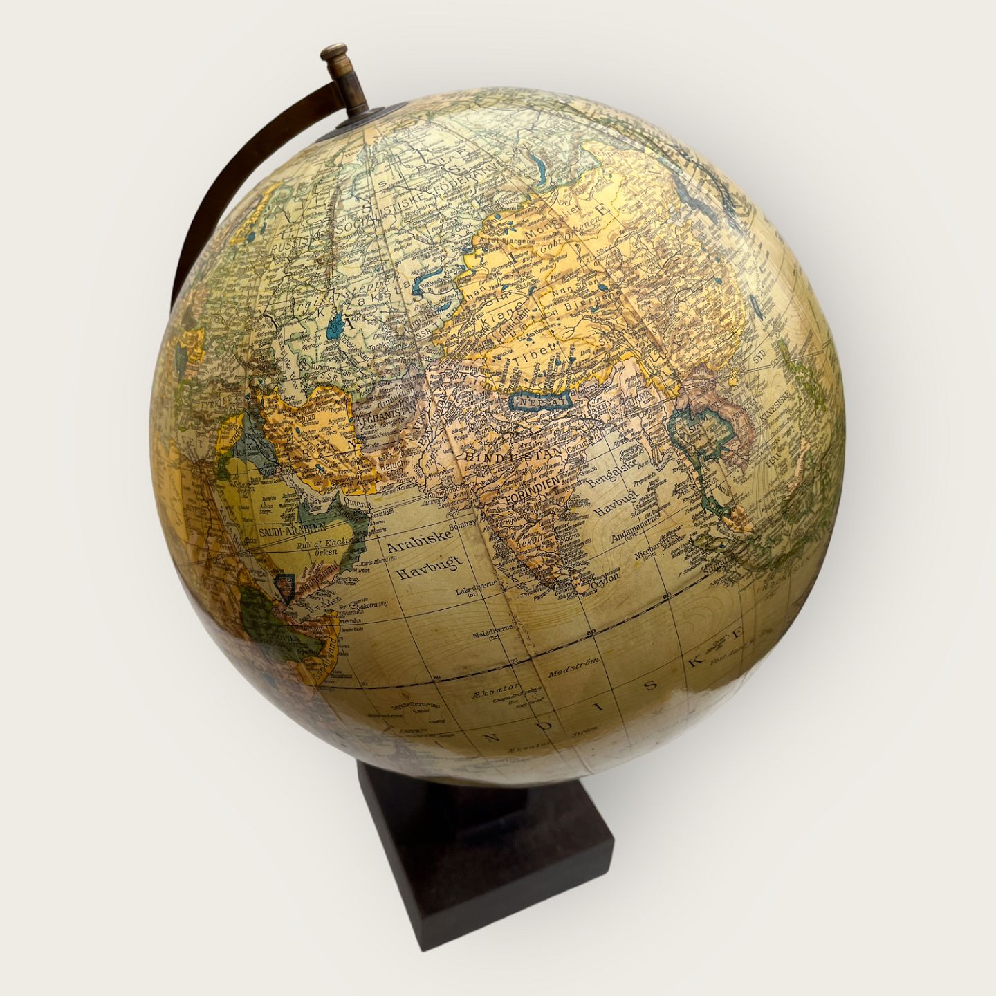 Old globe without light from "Arco" Globe, Copenhagen, 56cm high, Approx. 40cm wide, foot 14.5cm/14.5cm * The globe scratches a little on the hanger when it turns, otherwise nice patinated condition*