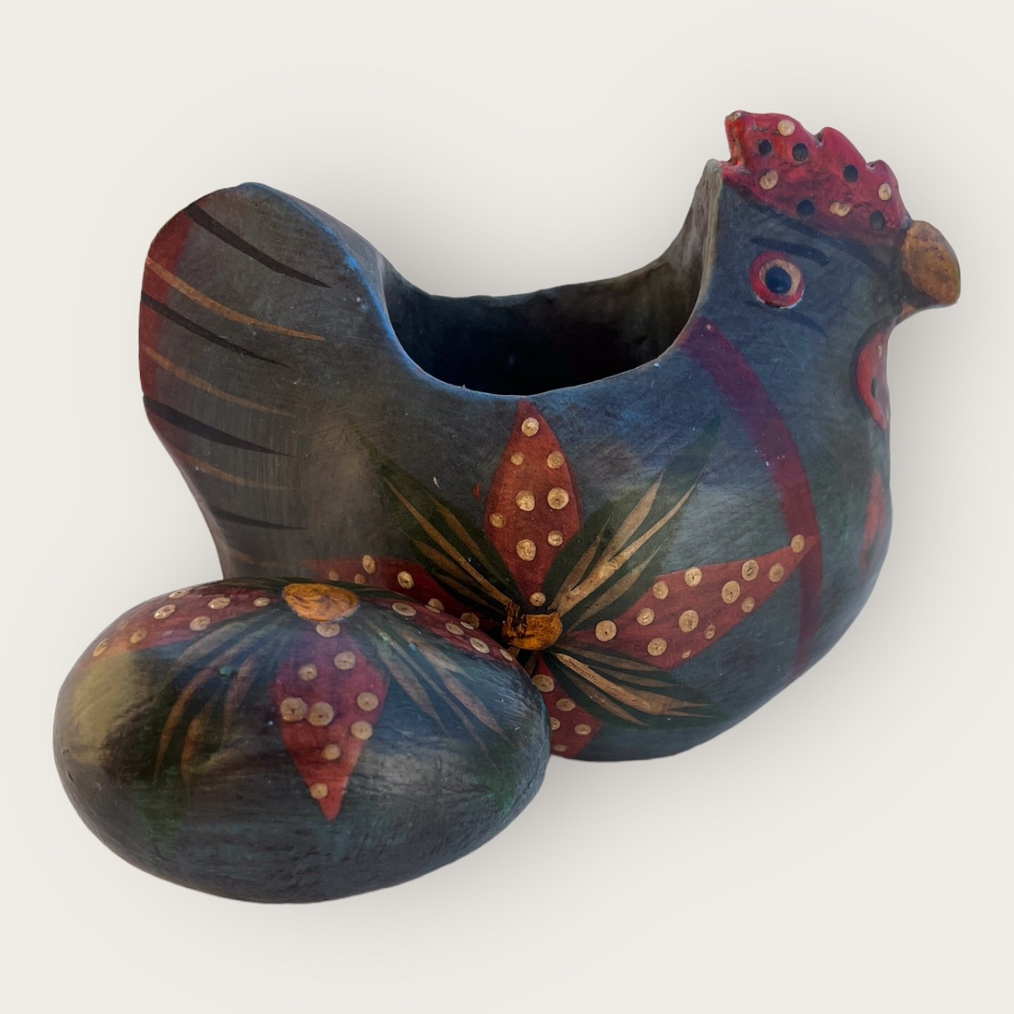 Ældre bemalet træhøne med et æg, Grøn med rød, gul mønster, 11cm bred, 9cm høj *Pæn stand*