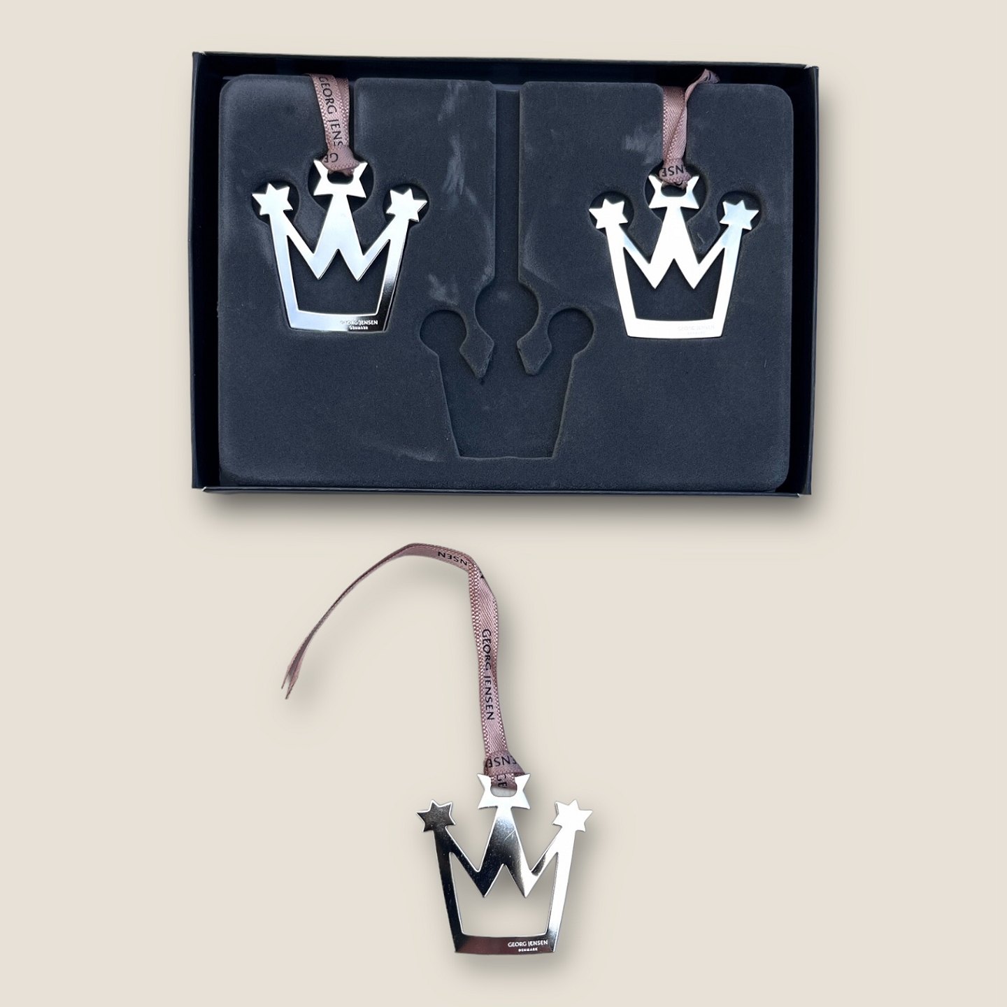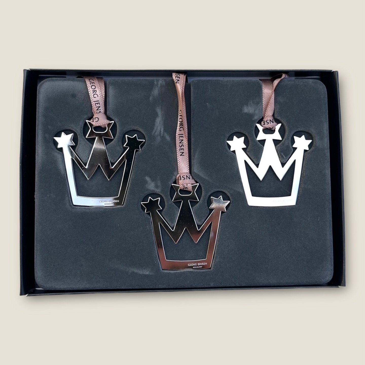 Georg Jensen, Gavemærker / Julepynt, Krone, Æske med 3 stk. design Malene Birgers *Perfekt stand*
