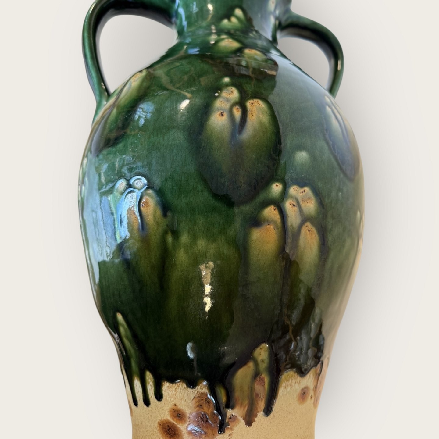 Stor gulvvase fra West Germany med grøn løbeglasur, Rigtig pæn stand dog en meget lille ujævnhed / afslag ved bunden (se foto), Højde 44 cm