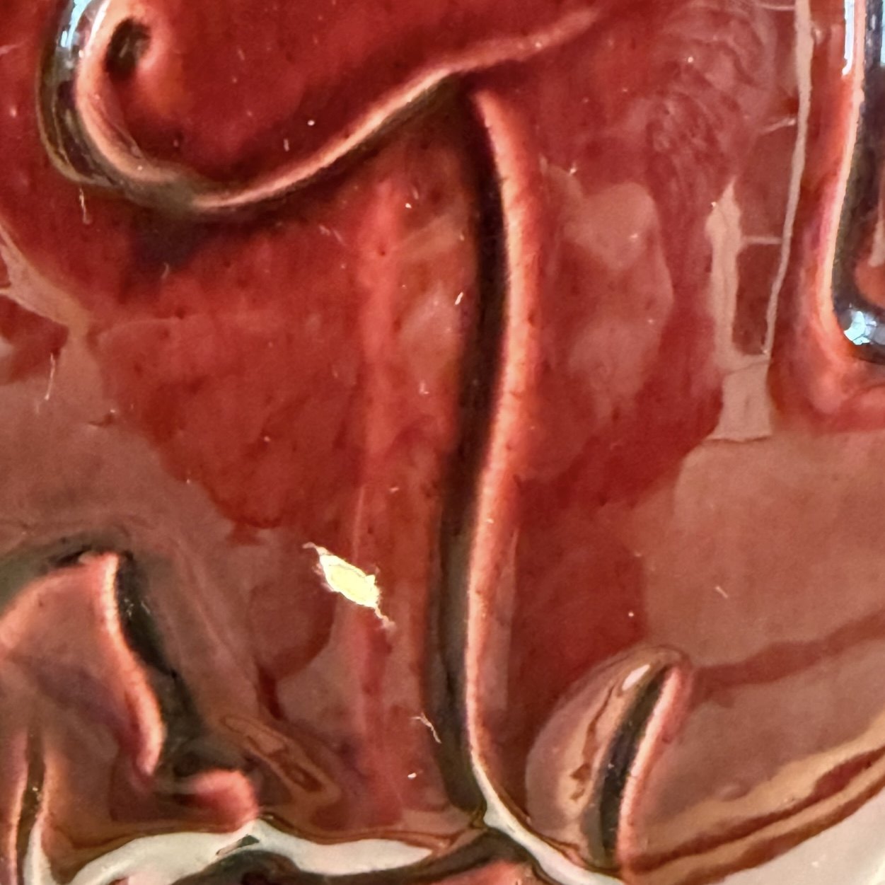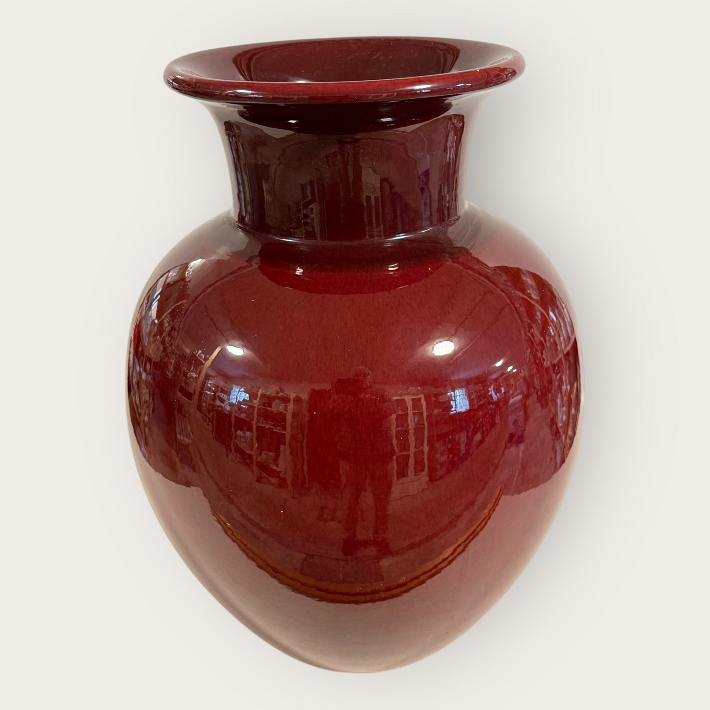 Stor gulvvase med springende hjort i okseblodsfarvet glasur fra Knabstrup keramik, Et enkelt lille afslag under hjortens hoved (se næstsidste foto) ellers pæn brugt stand, højde 41cm
