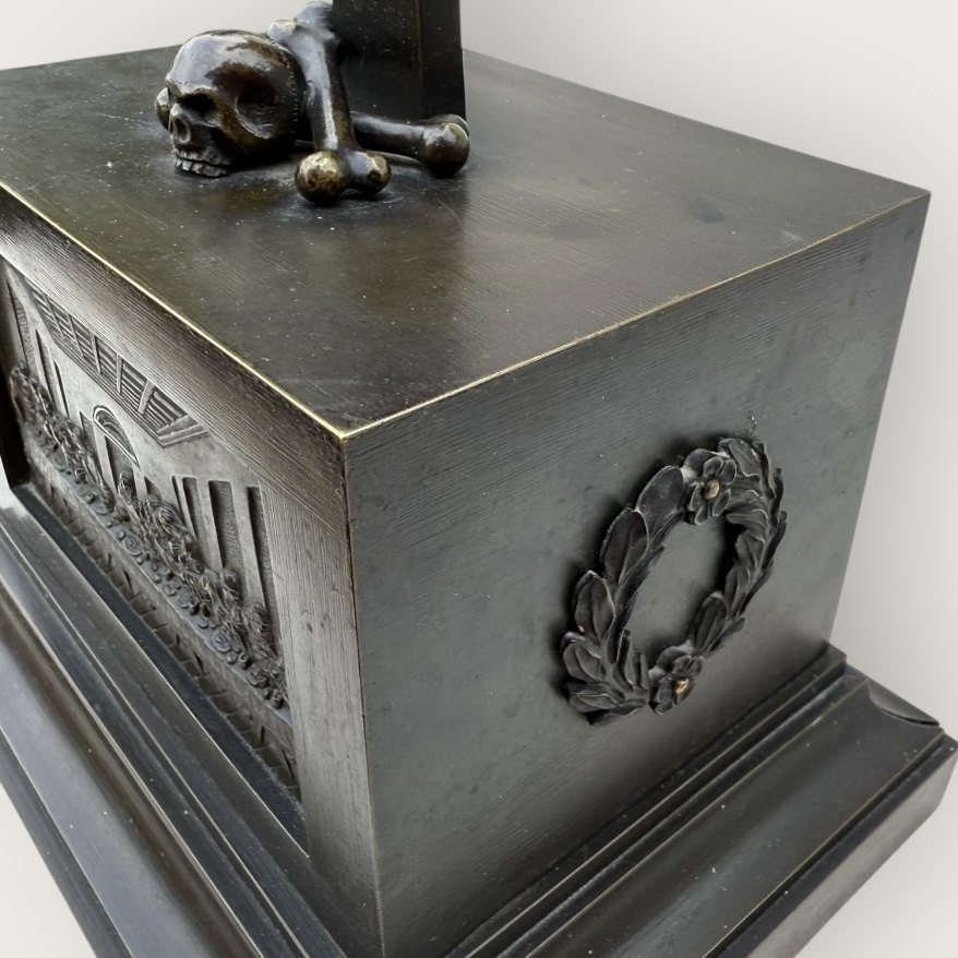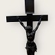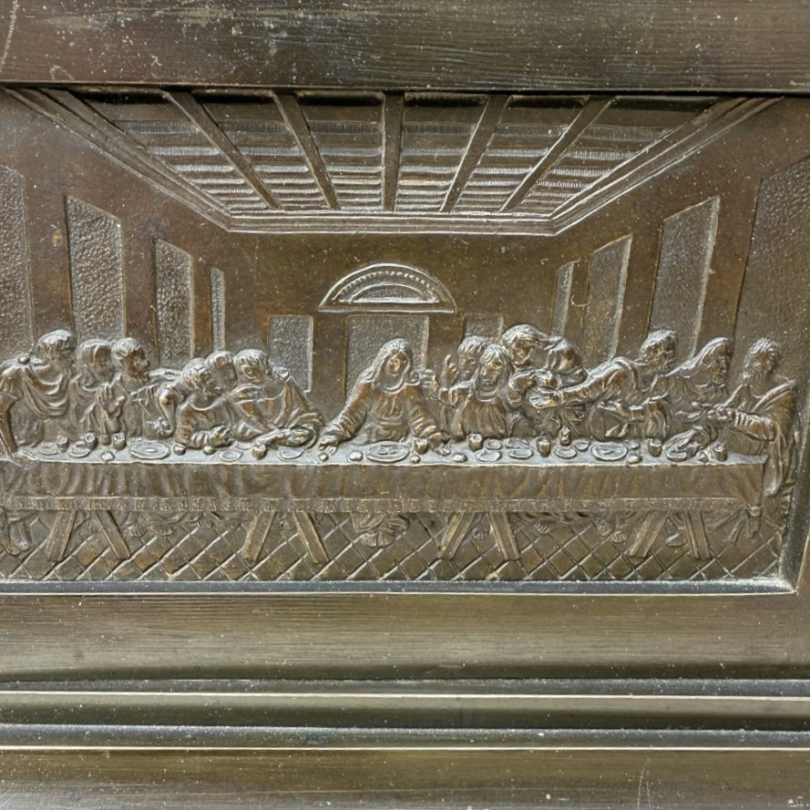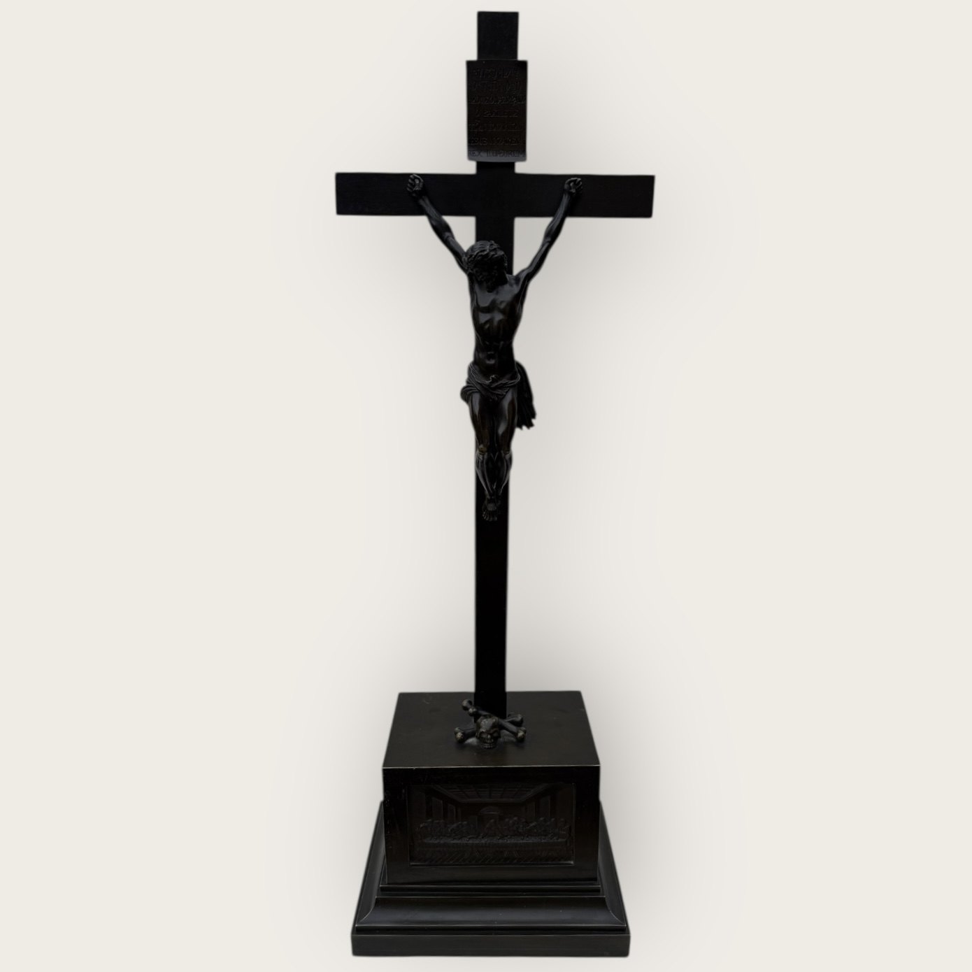 Stort Metal krucifiks / Jesus på kors opsat på metalfod, sandsynligvis fra Midt eller Sydeuropa, Flot stand med afbildning af "Den sidste Nadver" på foden og inskription på Græsk, latin og hebræisk øverst. Højde 70 cm, Fod 22x17cm