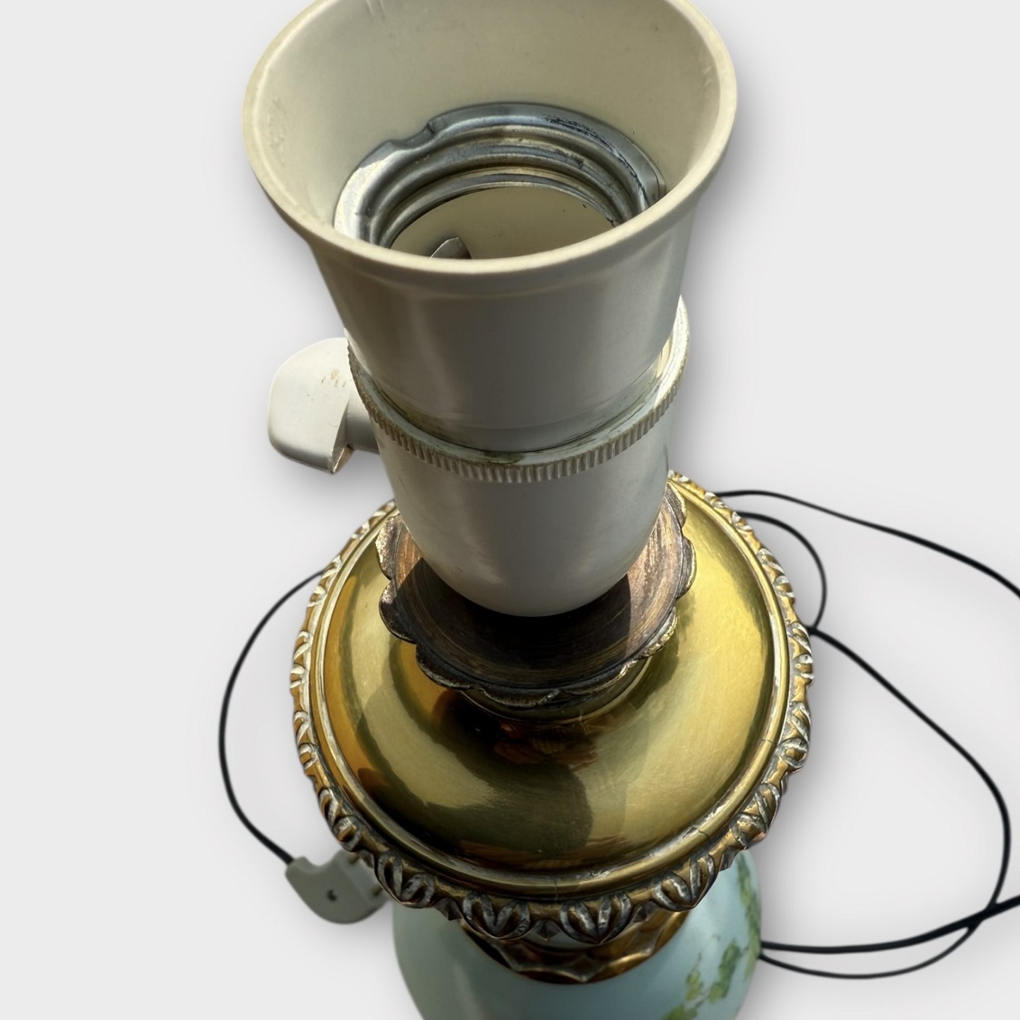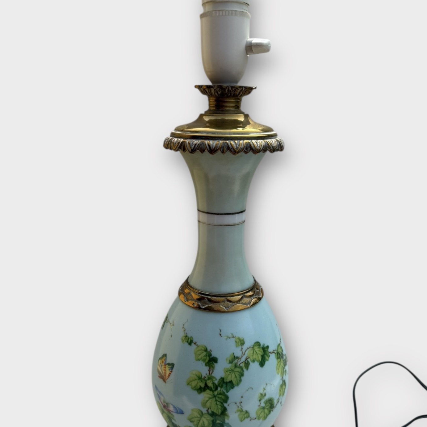 Large older table lamp painted on glass with ivy and butterflies, height with socket 48 cm, good used condition.