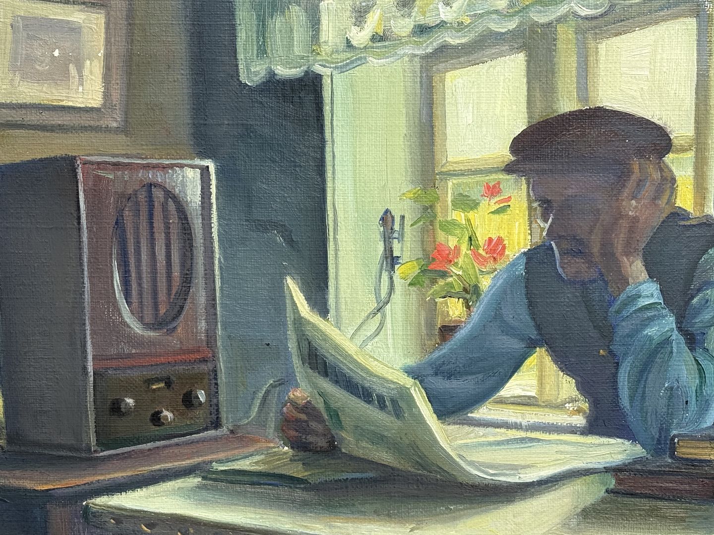 Svend Holm, Oliemaleri på lærred, på seddel på bagsiden påskrevet: Svend holm, Kaj i sin stue, Nr. 38 Søndervig, 33x41cm, samt stemplet fra Århus Kunstgalleri, mål med ramme 41x49cm