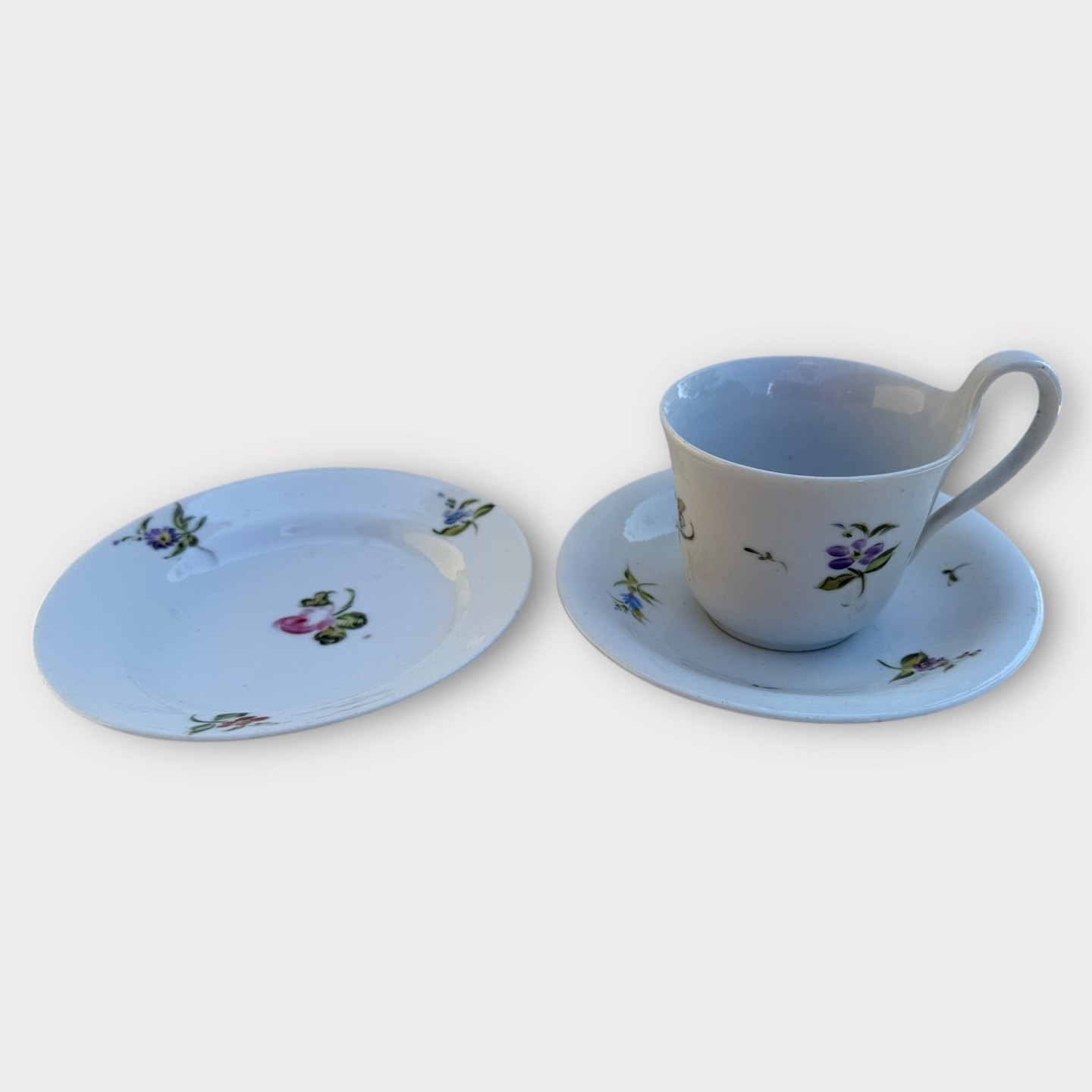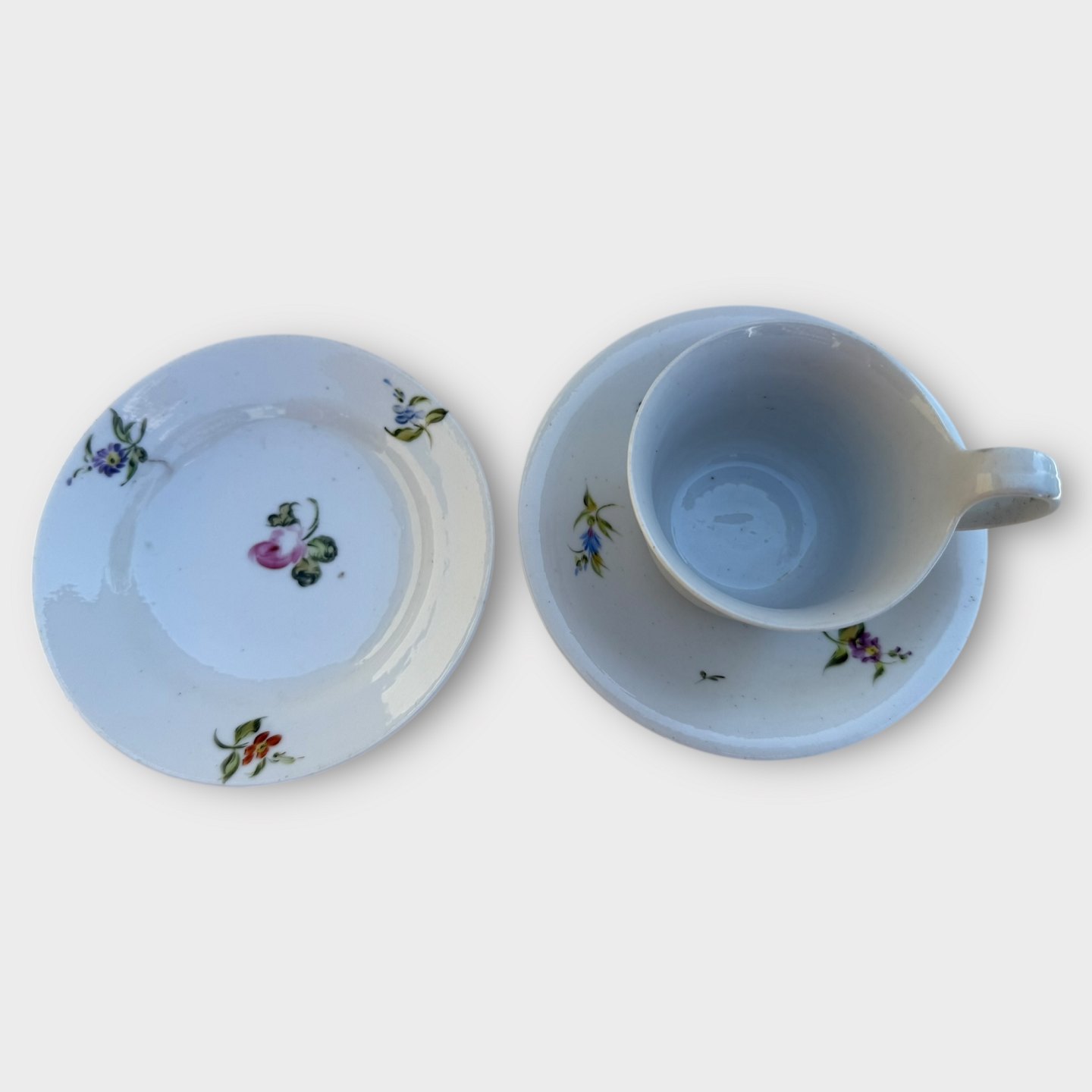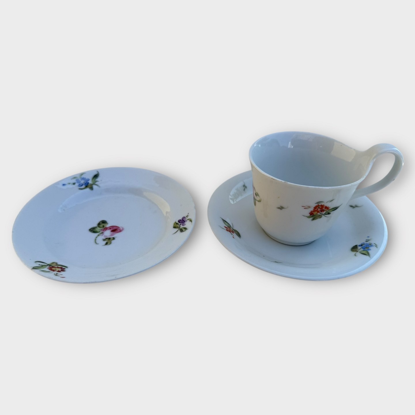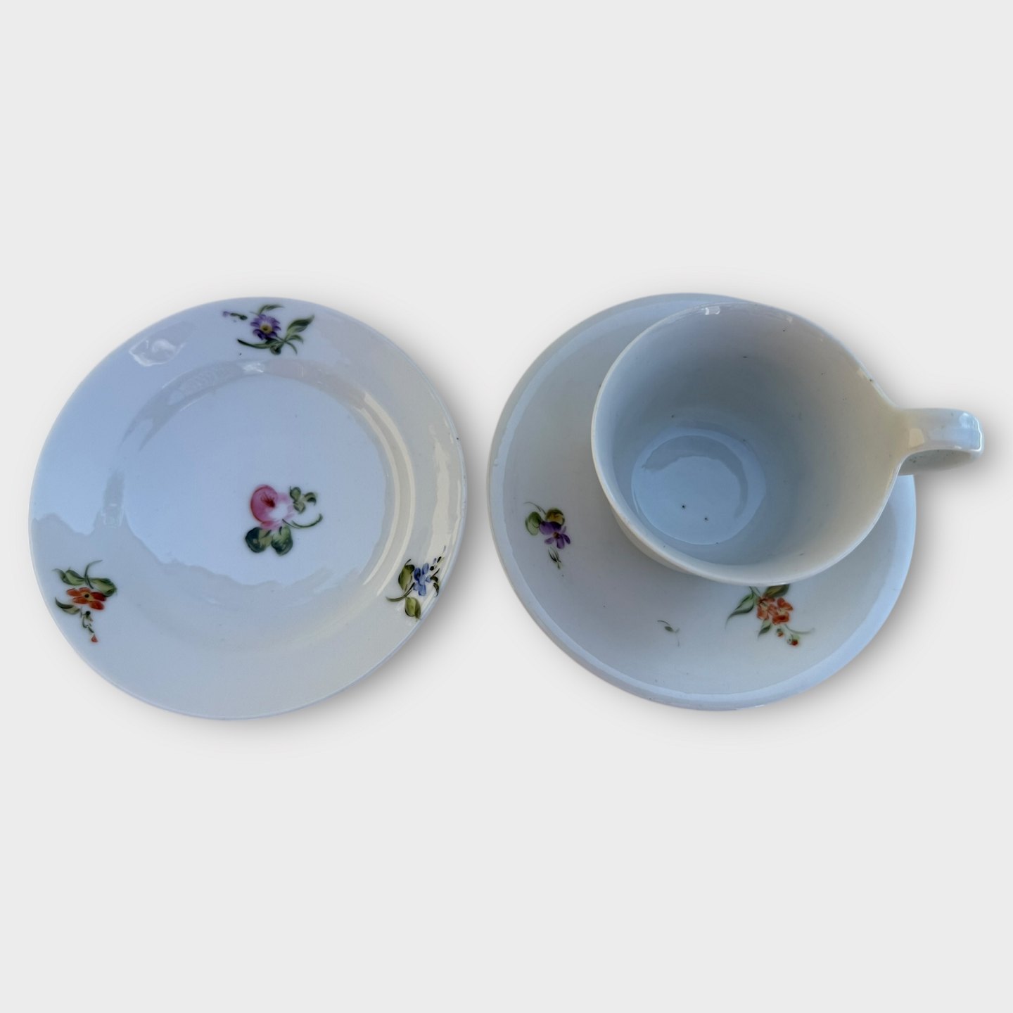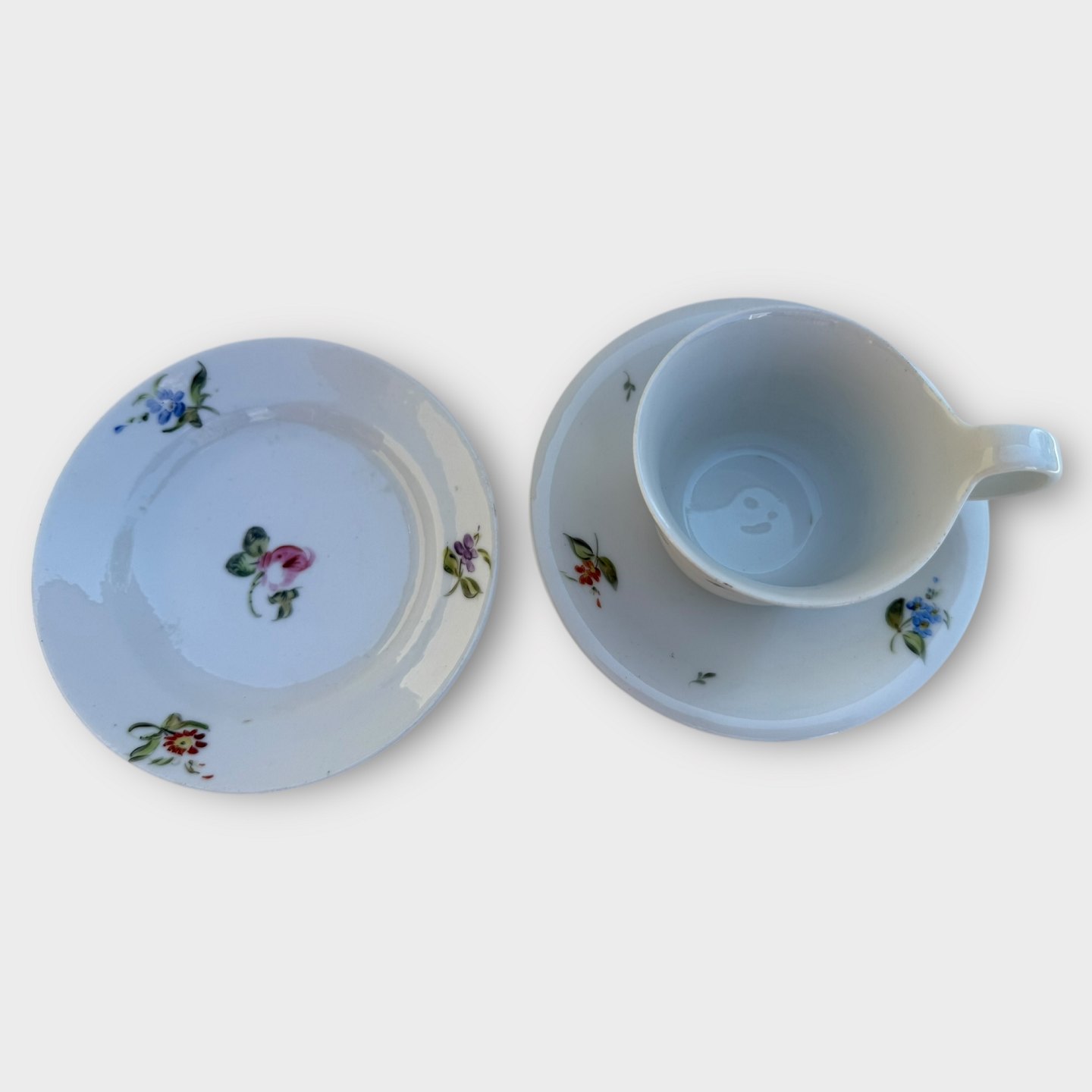 Bing & Grøndahl, Blomstrede kopper med tilhørende små sidetallerkener, Ældre højhanks kopper i pæn stand. Højde på hank 7,4cm Se også varenummer: 613897 og 613896
