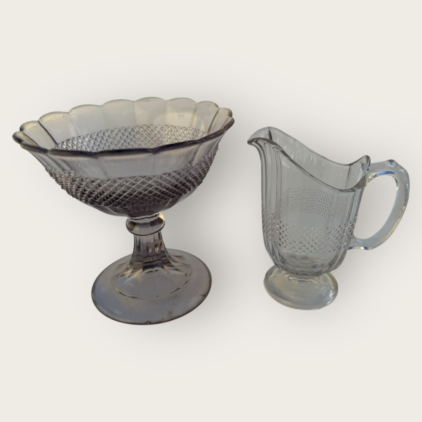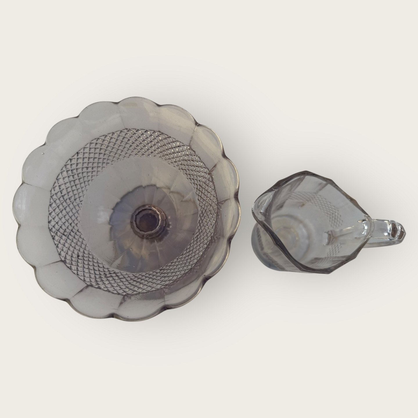 Candy bowl on a foot and accompanying cream jug in slightly pink tinted glass, Candy bowl 12cm high and 11.5cm in diameter, appears with a very small notch under the bottom, otherwise they are both in fine condition.