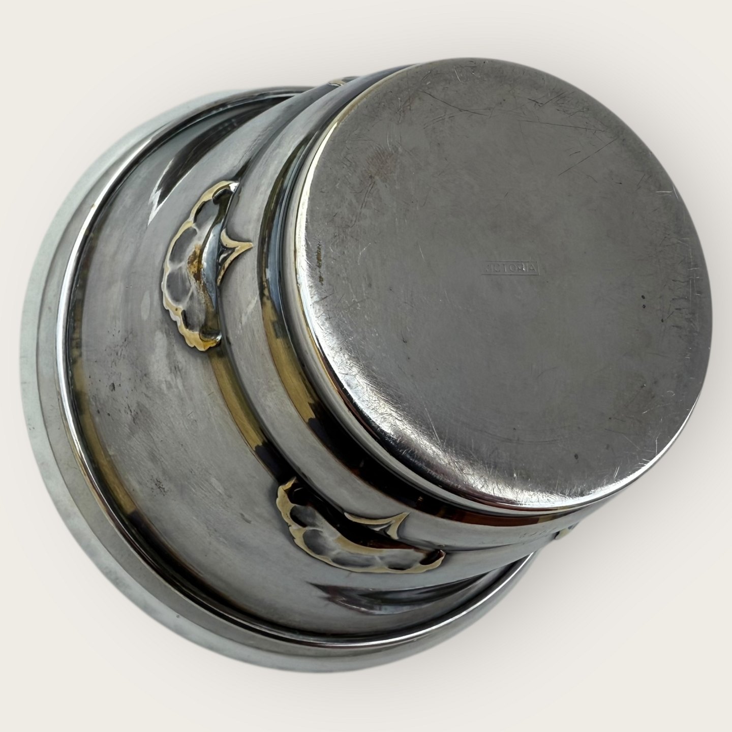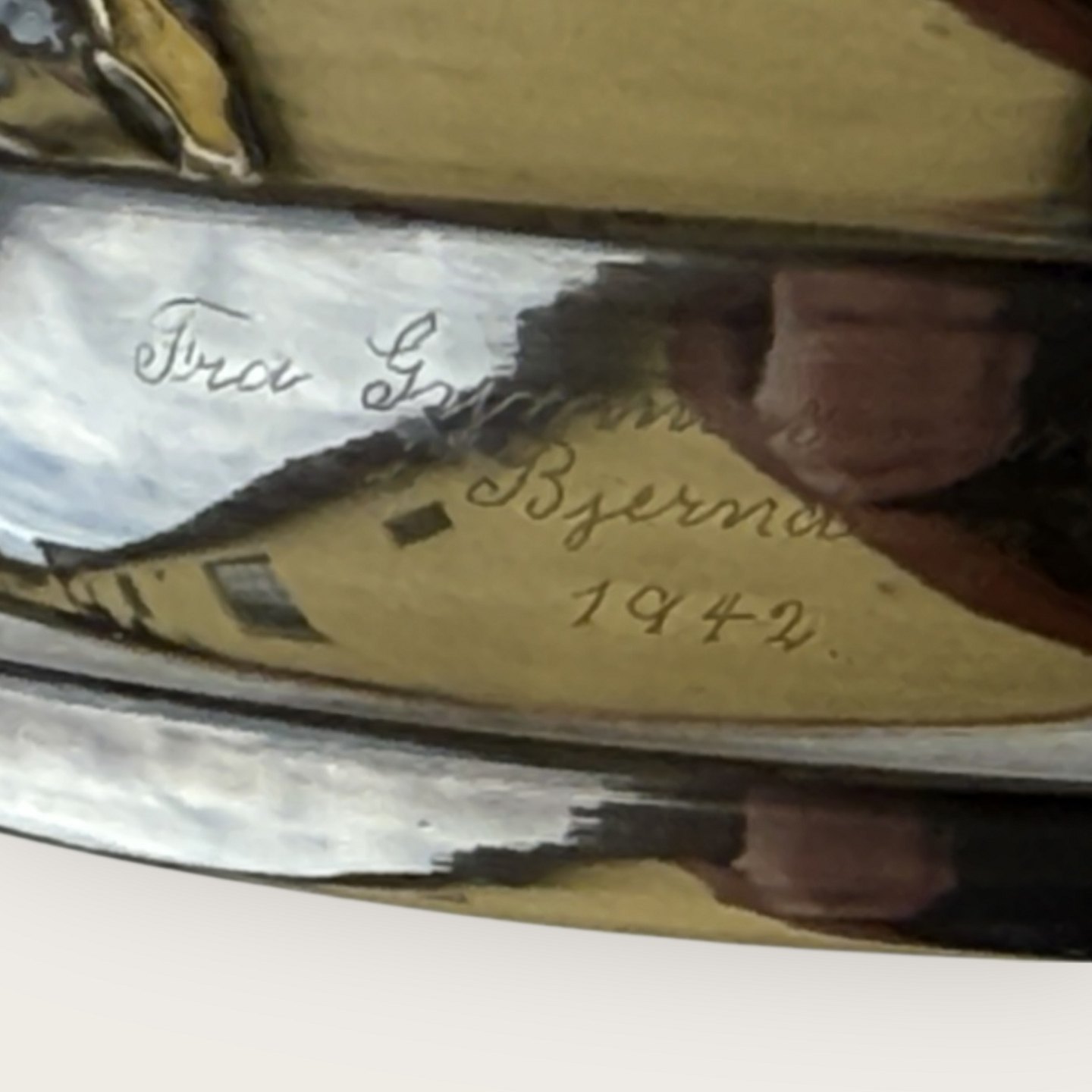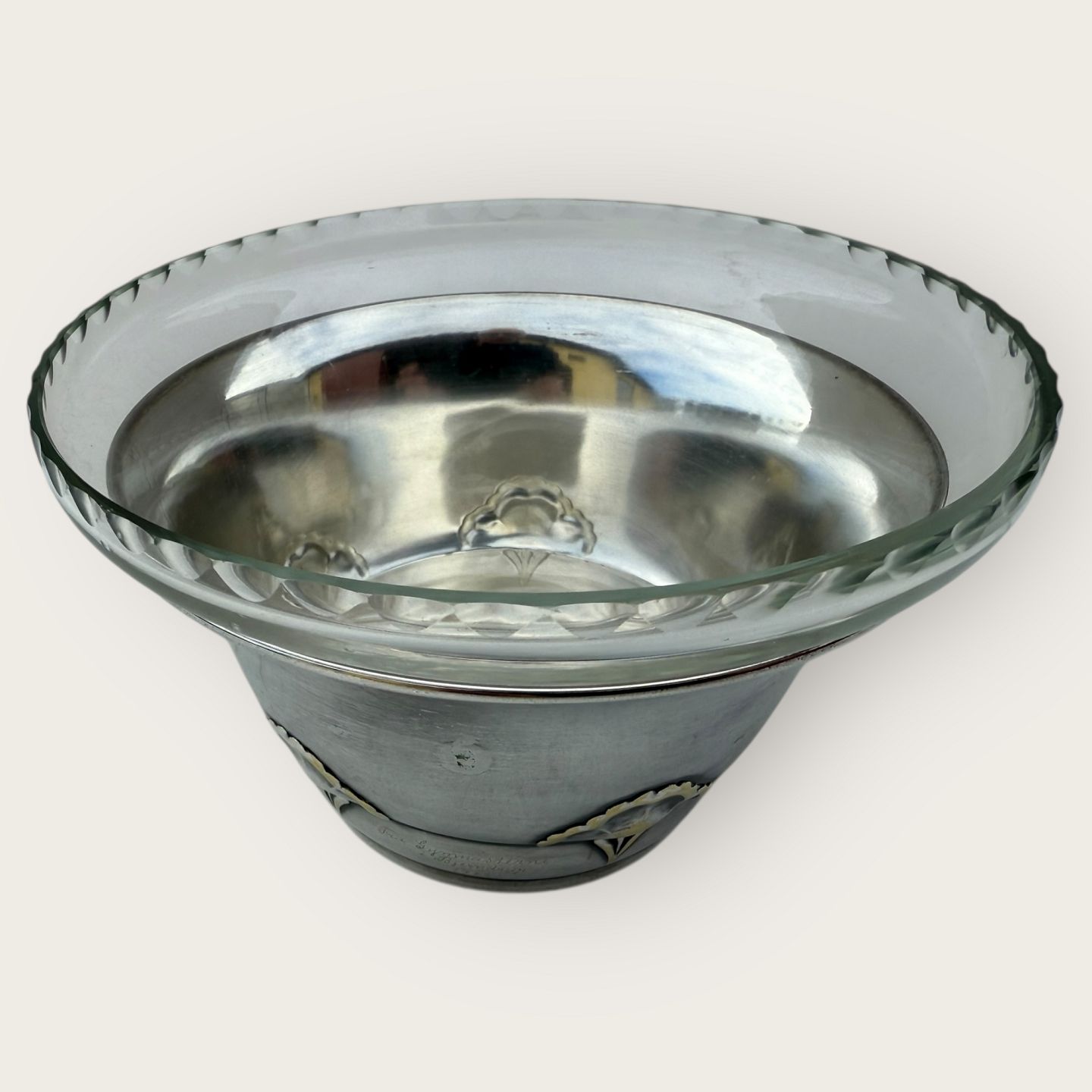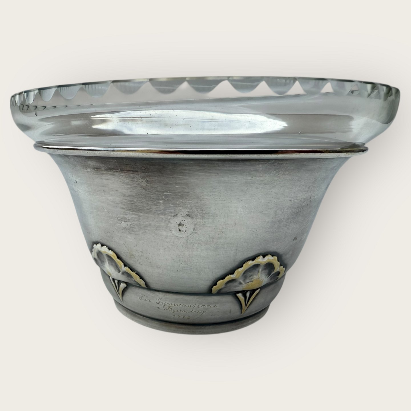 Small silver plated bowl with glass insert, height 8.5cm, diameter 13.8cm, glass insert in fine condition, silver plated bowl with patina and engraved: From the gymnasts in Bjerndrup 1942 / Fra gymnasterne i Bjerndrup 1942