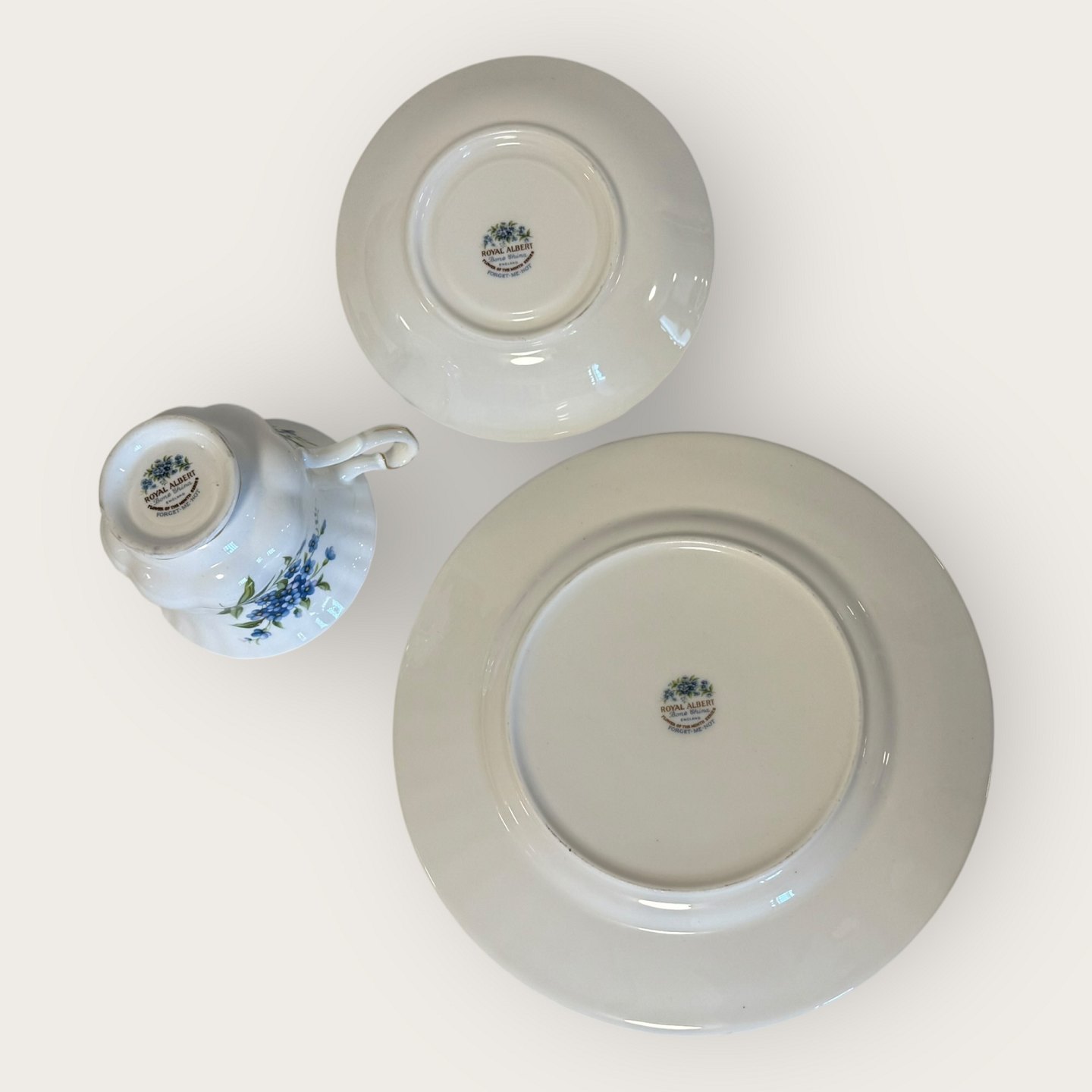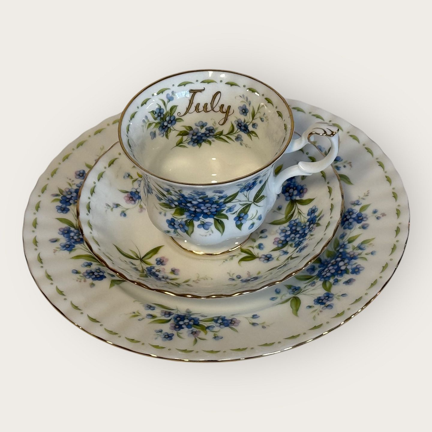 Royal Albert, Blume des Monats, Trio-Set bestehend aus Tasse, Untertasse und Kuchenplatte; Teller: Durchmesser 20,5 cm, Tasse: Durchmesser 9 cm, Höhe 7 cm. *In einwandfreiem Zustand
