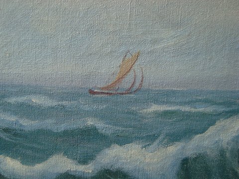 P. Weineke (20 årh): Kystparti med klippestykker, brænding og sejlskib. Olie på lærred. Sign.: P. Weineke. 29x49 (38x58)