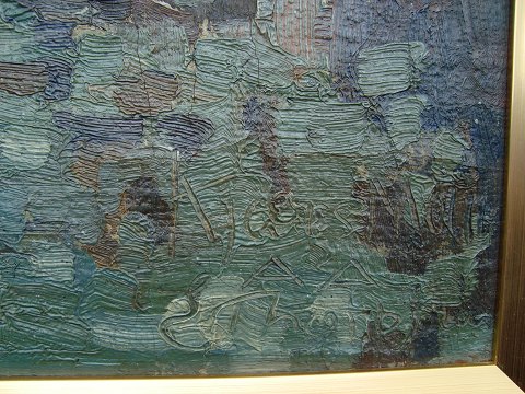 Evelyn Thorbjørn (1911-90): Parti fra Kjærs Mølle Å ved Aalborg. Olie på lærred (let krakeleret). Betegnet - Kjærs Mølle Aa. Sign.: E. Thorbjørn 48x39 (51x42)