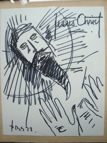 Peder Brøndum Sørensen (1931-2001): Opstandelses billede af Jesus 1972. Betitlet - "Jesus Christ" Tusch på papir. Sign.: PBS - 72. 18x15 (23x19)